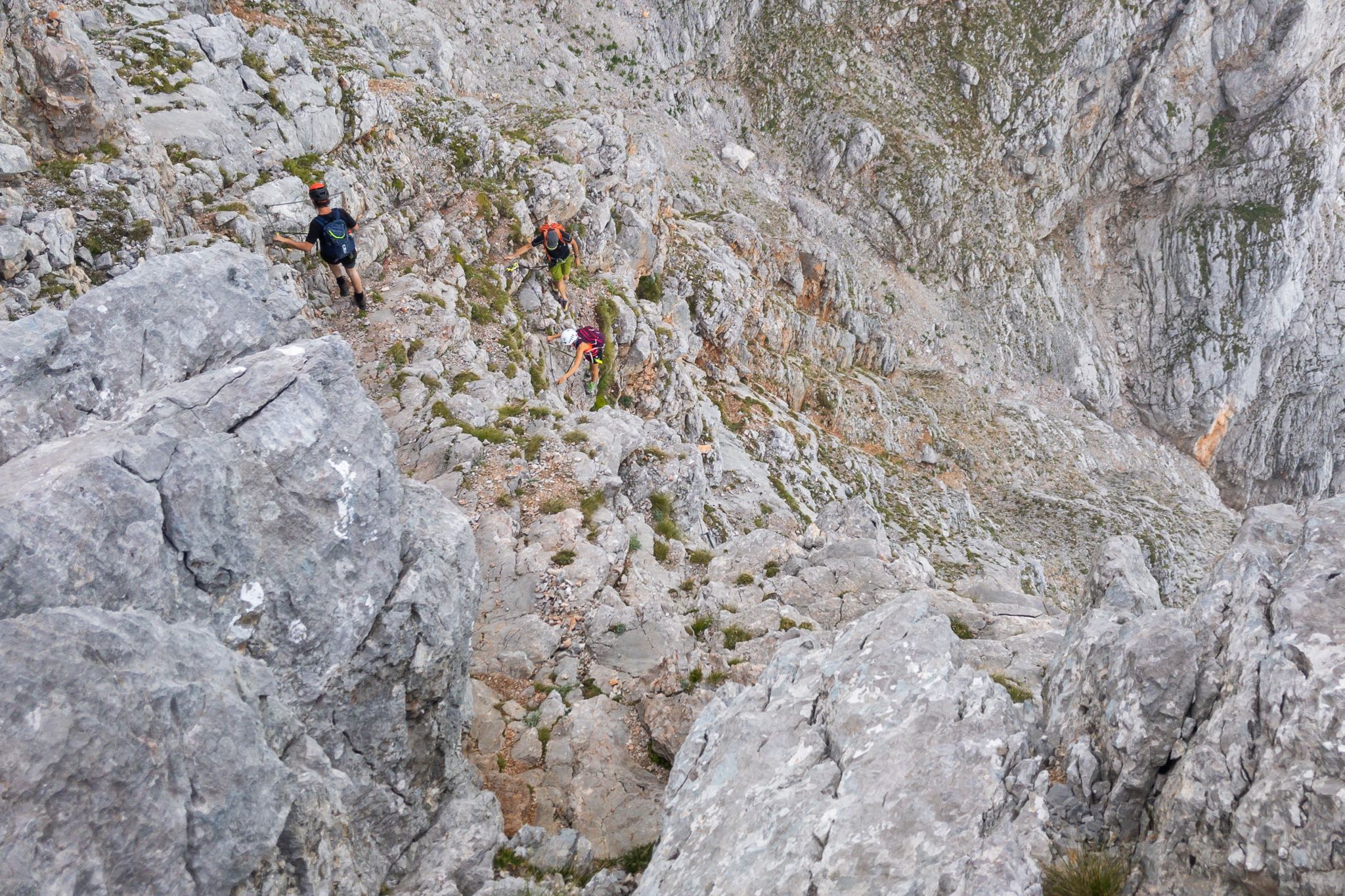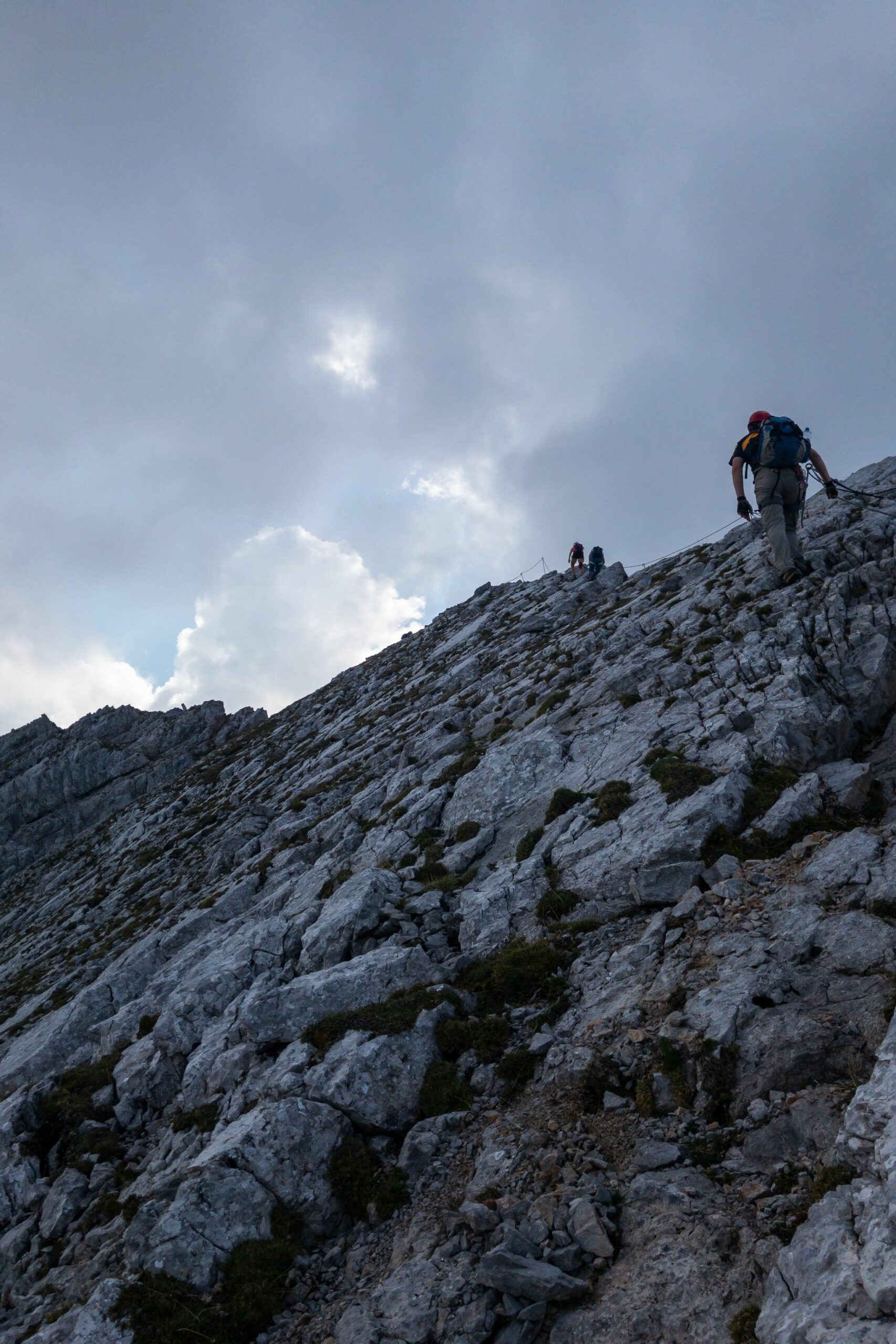 Über das letzte Stück am Grat geht es zurück zu einem markanten Wegweiser. Wer keine Lust auf weitere Drahtseilakte hat, kann auch dem alten Normalweg folgen, der noch schwach markiert über die Westflanke relativ gerade hinab zurück zur Hütte führt. Der durchaus Steinschlag gefährdete Abstieg beinhaltet die ein oder andere leichte Kletterstelle.