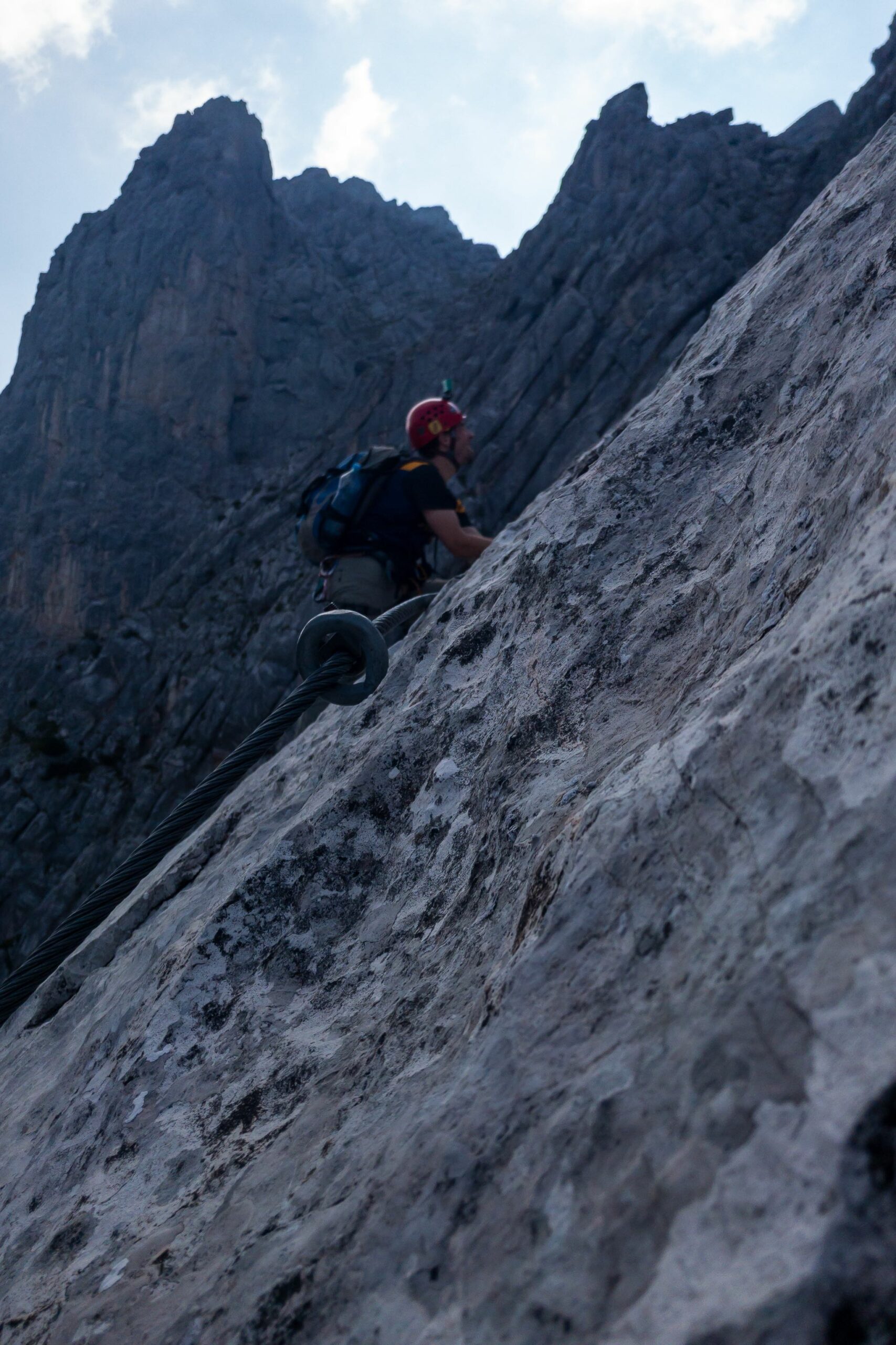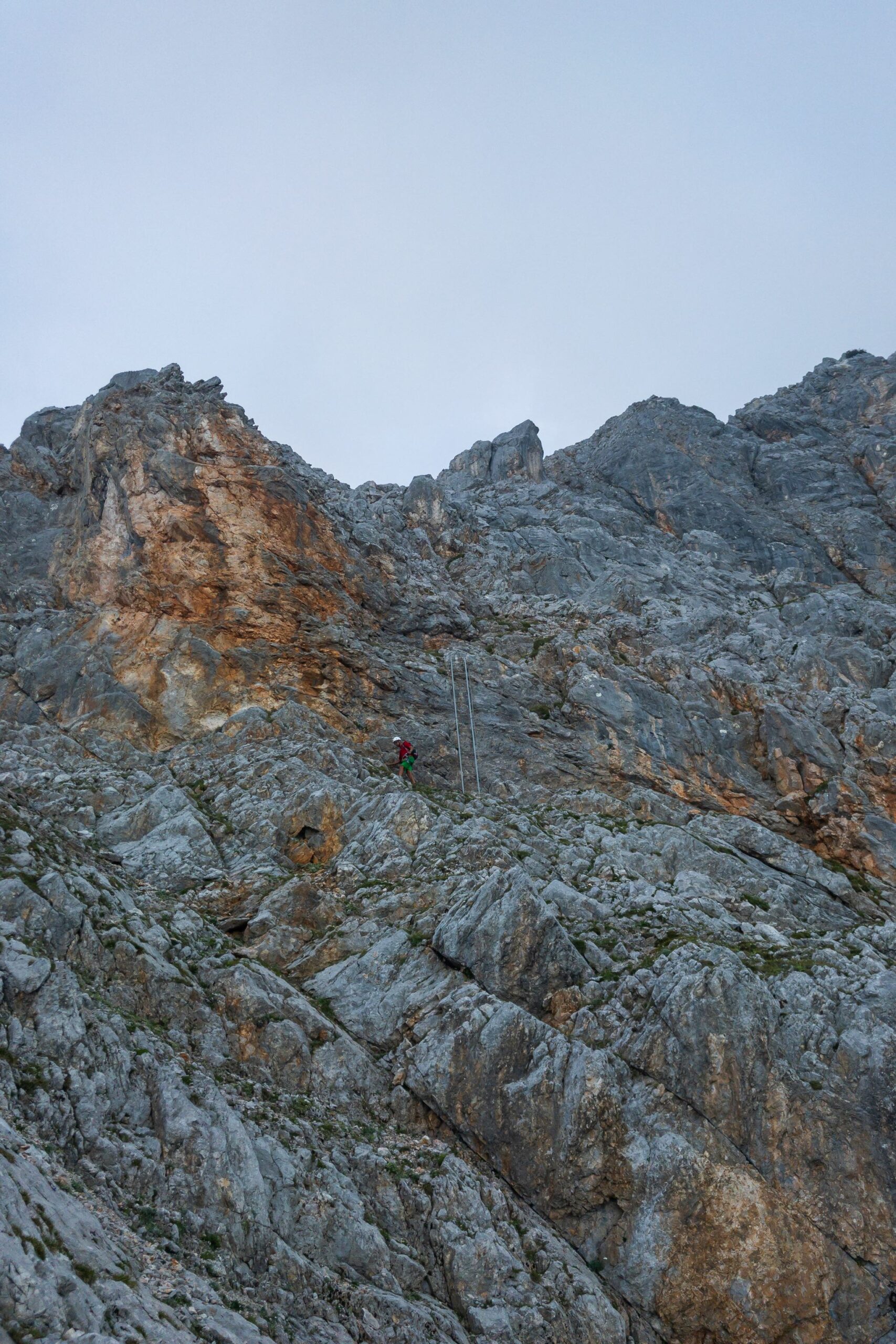 Im Gegenteil: Der Wildental-Klettersteig auf das Persailhorn macht richtig Spaß. Echter Felskontakt, hier und da eine Stelle, wo man richtig zupacken muss. Und ganz viel Genuss. In der schattigen Nordwand geht es über Leitern das Jagadiener Wandl nach oben, einem Kamin und einer etwas ausgesetzteren Stelle folgt ein letzter (und langer) Anstieg zum Gipfelkreuz.
