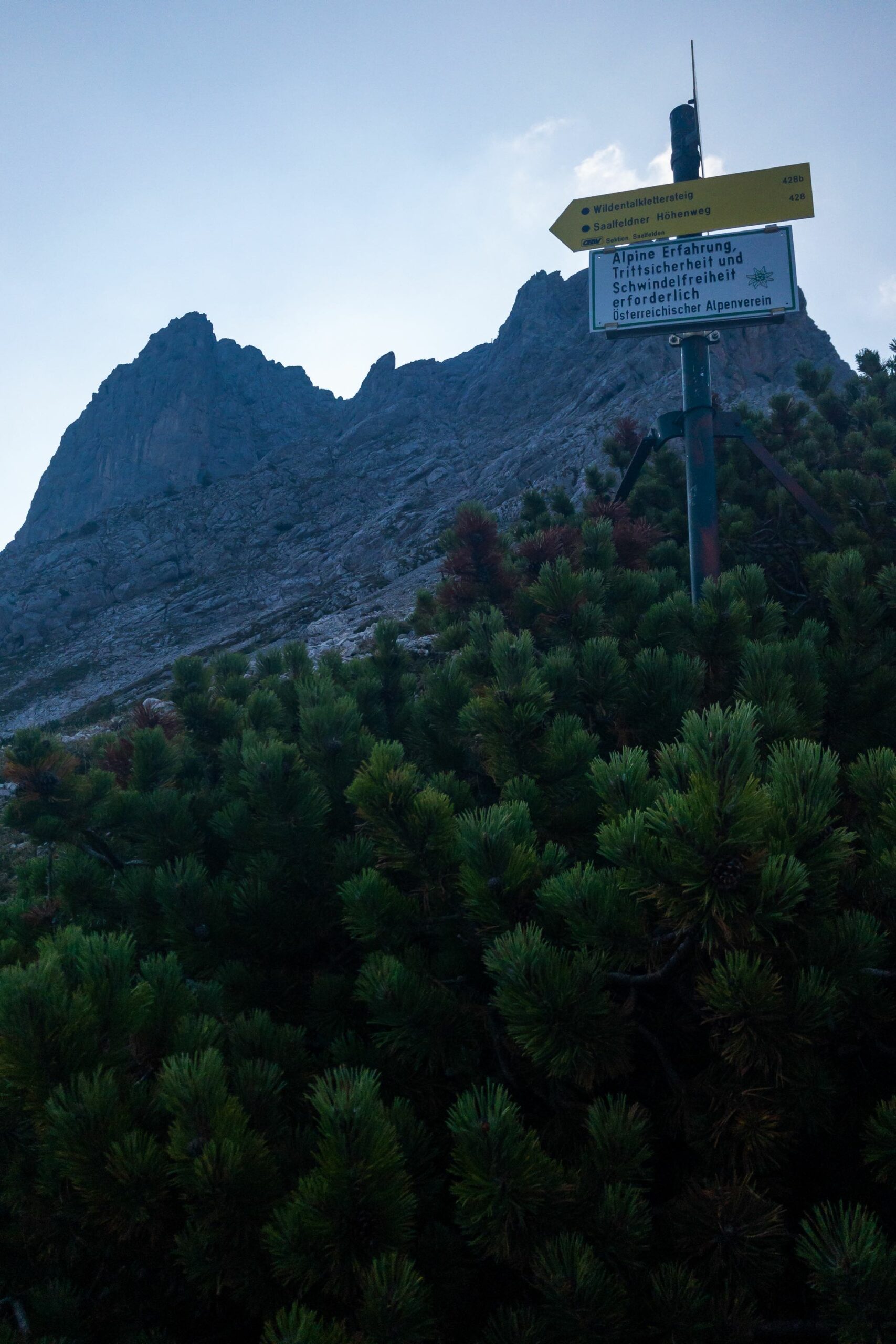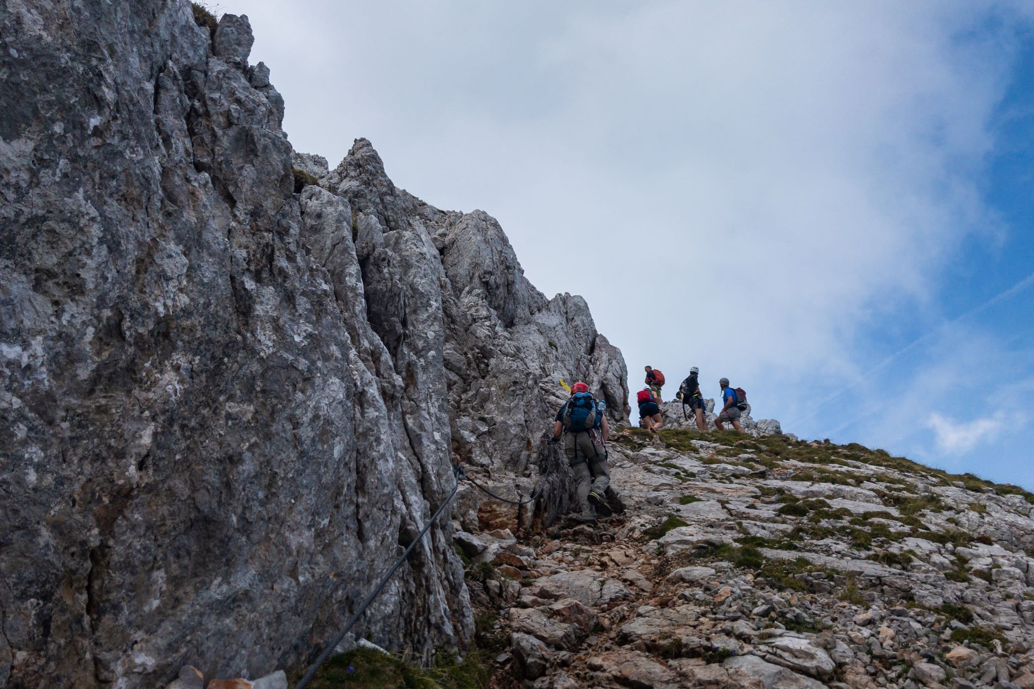 Der Wildental-Klettersteig führt uns zunächst gen Norden, wo die Felswände von Praghorn, Finsterbachkopf und Windbachkopf die eindrucksvolle Aussicht begrenzen. Zahlreiche Gämsen lassen sich nicht von uns beeindrucken. Nach dem Anlegen des Klettersteigsets und des obligatorischen Helms kann es losgehen.