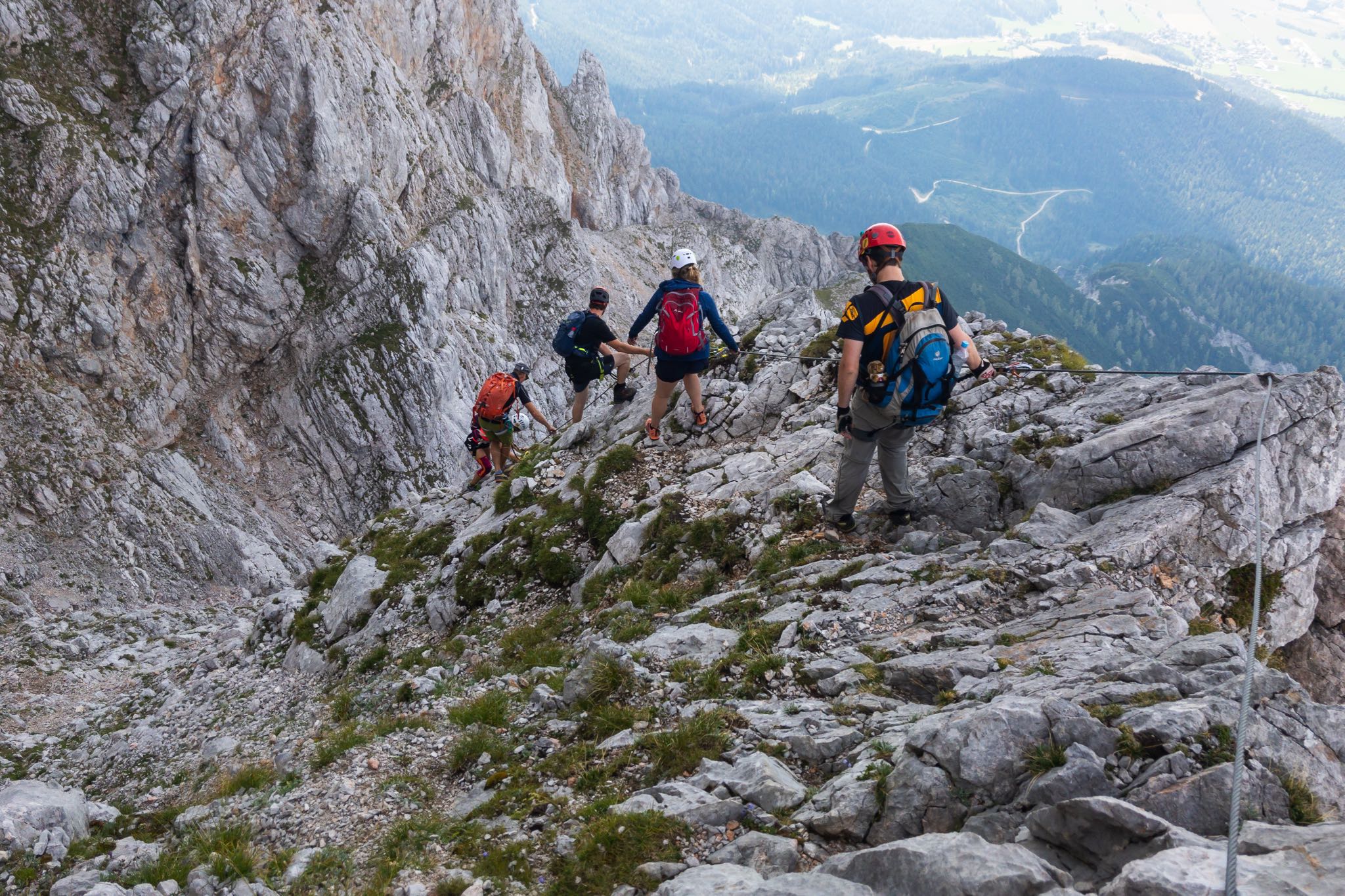 Die sogenannte Wastlpromenade, eine ausgesetzte Querung mit viel Luft unter dem Hintern, ist das erste Highlight des Wildental-Klettersteigs. Bis hierhin sind die versicherten Stellen nicht wirklich anspruchsvoll und auch für Klettersteig-Neulinge gut zu machen. Von denen haben wir beim Bergzeit Frischluftkick gleich mehrere dabei. Trotzdem kommt keiner der Teilnehmer bei den Schwierigkeiten, die sich nie höher als B/C (detaillierte Beschreibung bei via-ferrata.de) bewegen, an seine Grenzen.