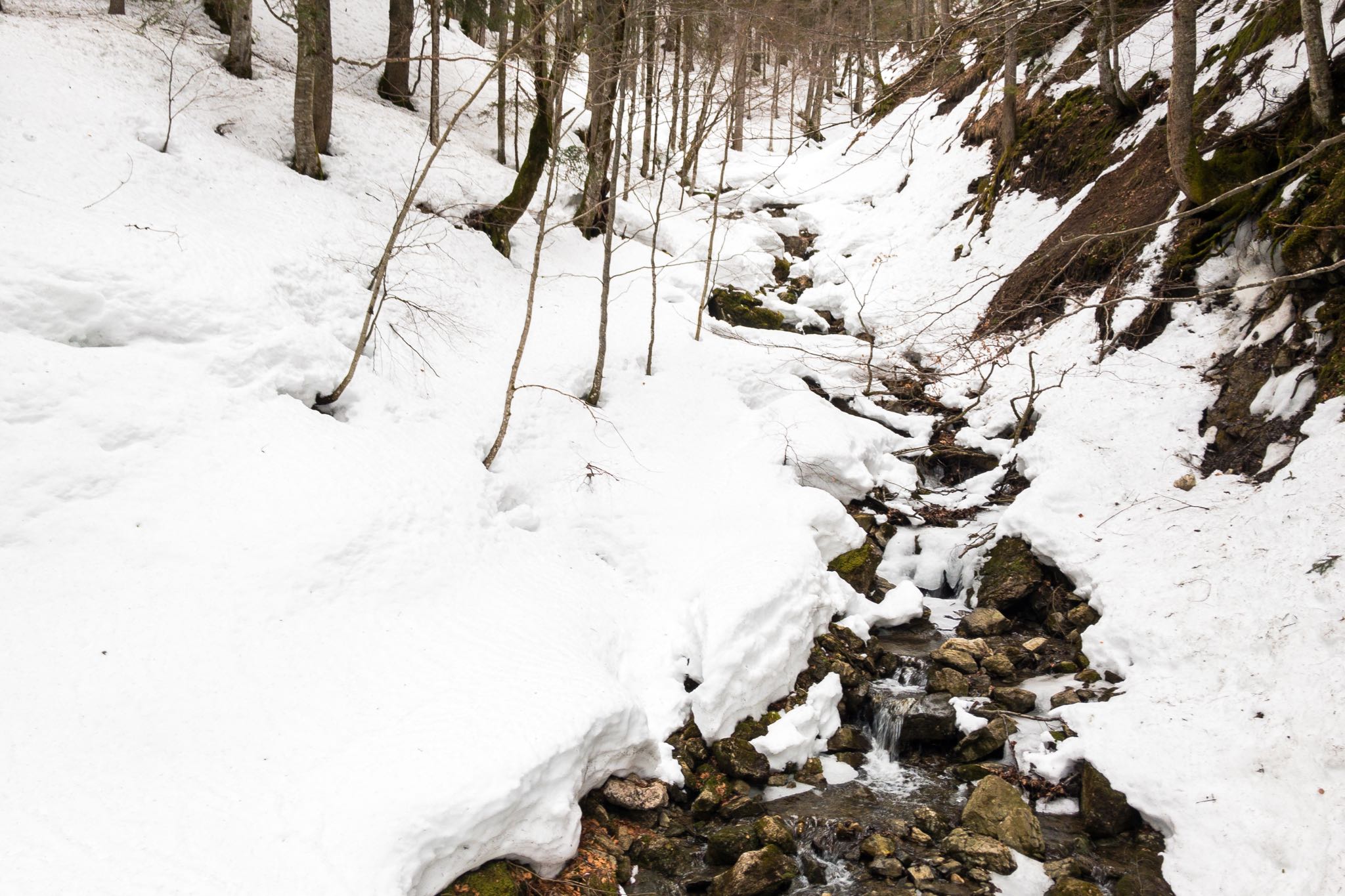 Aber nicht nur die Querung birgt Gefahrenpotential. In Gräben und Rinnen sammelt sich häufig mehr Schnee und naturgemäß hält er sich dort auch länger. Mit dem Abschmelzen des Schnees wird das Schneefeld im Frühling von unten nach und nach ausgehöhlt, ohne dass es von oben wahrnehmbar ist. Was vielleicht stabil aussieht, ist es möglicherweise gar nicht mehr und irgendwann wird die Schneebrücke nicht mehr tragfähig sein. Wer diese dann betritt, ohne die Festigkeit und Stabilität überprüft zu haben, hat im besten Fall nasse Füße.