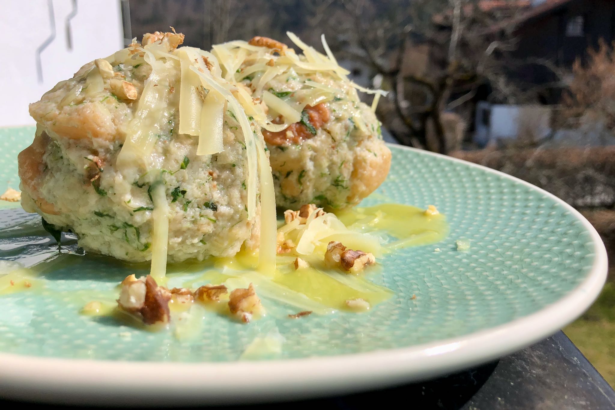 5 Die Bärlauchknödel aus dem Wasser nehmen, abtropfen lassen und mit geschmolzener Butter, dem Rest des geriebenen Bergkäses und zerkleinerten Walnusskernen servieren.