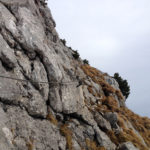 Wir nehmen trotz des Schnees die direkte, schwierigere, fast schon alpine Variante. Der Schnee ist fest und bietet so auch in den steileren Passagen guten Halt. Ein paar kurze Drahtseil versicherte Stellen sind zu überbrücken, hier und da die Hand an den teils aperen Fels gelegt und so kommen wir in etwa 20 Minuten direkt bis zum Gipfel des Roßsteins, der mit einer Höhe von 1698 Meter geringfügig kleiner ist als sein Nachbar.