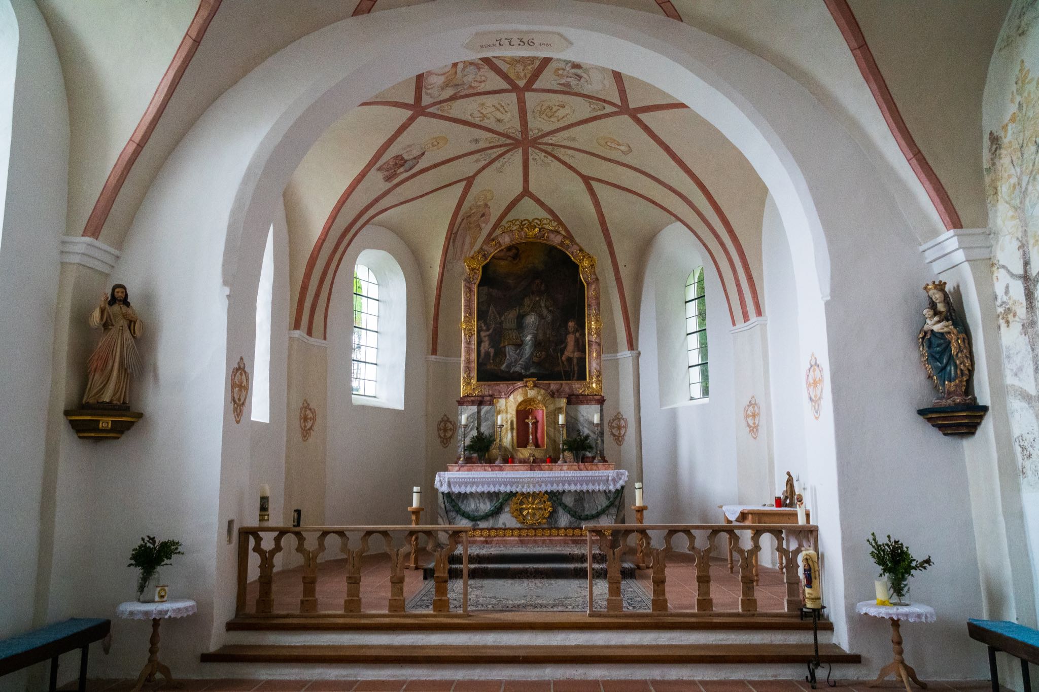 Nächstes Ziel ist die Schnappenkirche, die furchteinflößend steil über dem Achental zu thronen scheint. Winzig klein, kaum größer als eine Kapelle wie sie oft am Wegesrand stehen, wirkt sie von unten. Zu unserer Überraschung ist sie das nach dem langen, zum Glück gar nicht so steilen Aufstieg vorbei an der Burg Marquartstein und über Waldwege aber doch nicht. Wer wohl auf die Idee gekommen ist, gerade hier eine Kapelle zu errichten?
