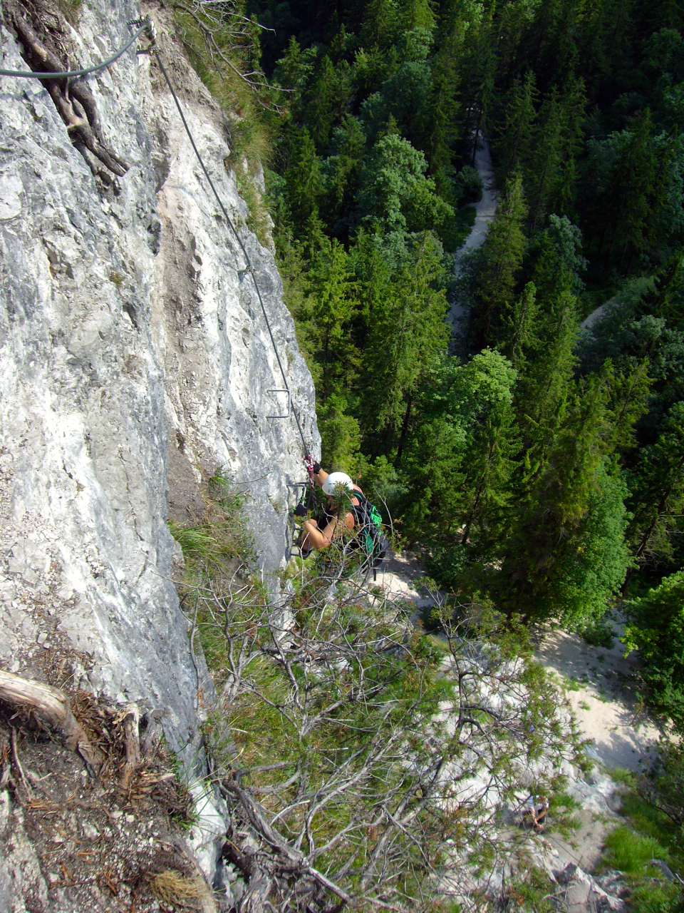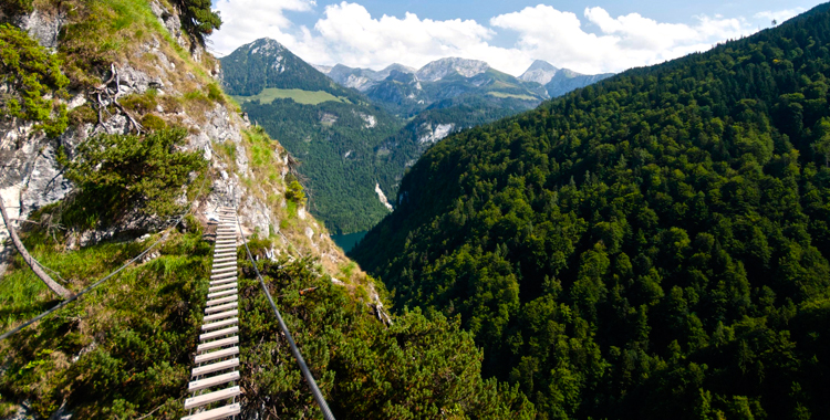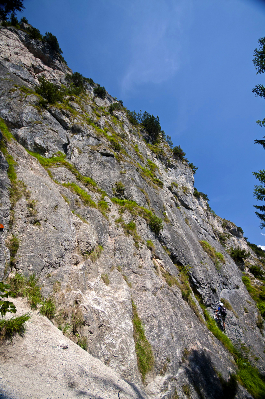 So ganz ohne Höhenmeter geht es aber doch nicht, schließlich wartet nun noch der Aufstieg zum Grünstein, mit seinem Gipfel auf 1.304 Metern Höhe zugleich höchster Punkt des Tages. Relativ lang und ein wenig eintönig geht es durch den Wald hinauf bis zur Grünsteinhütte, von wo es nur ein kurzer Abstecher zum Gipfel des Grünsteins ist. Am Fuß der Wand, wo in der Hauptsaison unzählige Klettersteiggeher die verschiedenen Varianten des Grünstein-Klettersteigs bezwingen, wandern wir relativ steil und flott bergab und gehen schließlich parallel zur Bobbahn die letzten hundert Meter hinab bis zum Königssee.