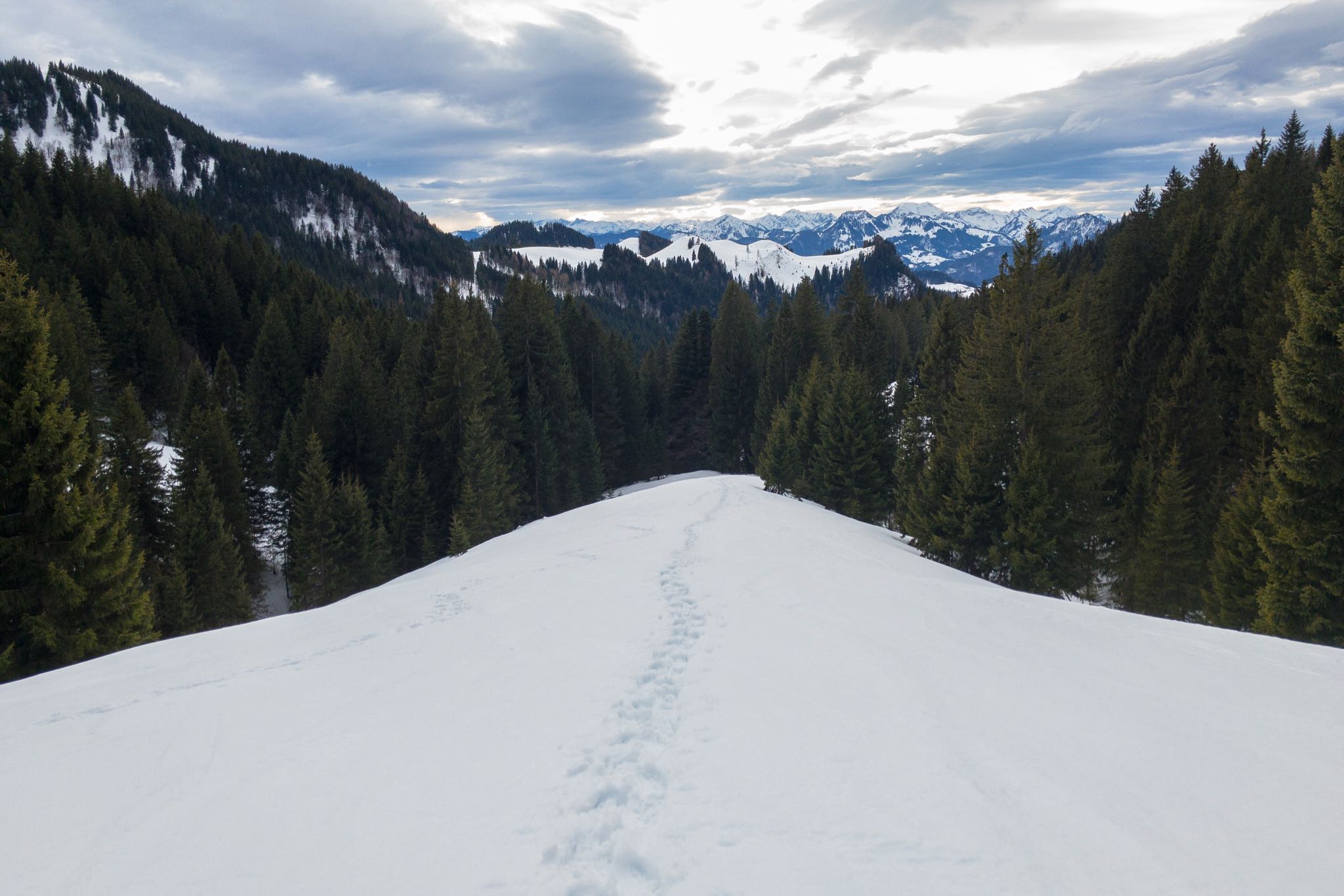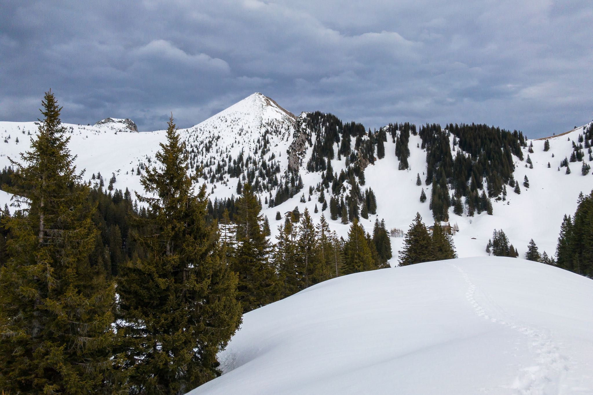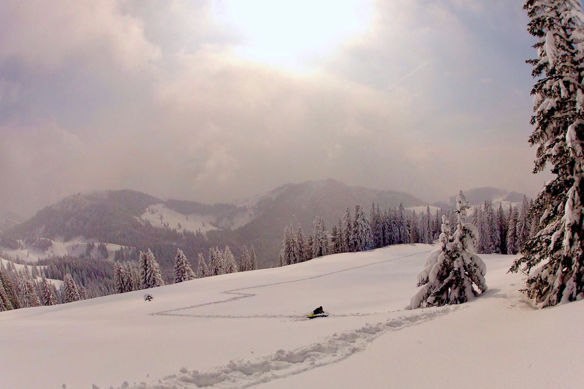 Bedeutend ruhiger als auf dem benachbarten Geigelstein geht es auf dem Mühlhörndel zu. Von der Priener Hütte führt diese Schneeschuhwanderung zunächst in gleicher Richtung wie beim Aufstieg zum Geigelstein. Auf Höhe der Oberkaseralm hält man sich aber gen Westen. Am Kamm angekommen, wartet zur Rechten der Abstecher zum Wandspitz (1.685 m). Zur Linken führt der Weg über einen namenlosen Gipfel (1.658 m) und leicht abfallend bis zum Mühlhörndel (1.519 m).
