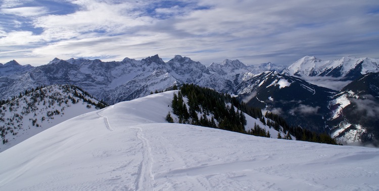 Irgendwann tut er es dann aber doch und die immer deutlichen Spuren führen nun in einer breiten Waldschneise etwas steiler werdend bergan. Eine lange Lichtung wird gequert und ich freue mich hier schon auf die Abfahrt. Es geht durch zwei kurze Waldabschnitte und an der Baumgrenze angekommen, wird auch bald der Blick auf den letzten Anstieg zum Gipfel frei. Auch der macht beim Anblick schon Freude. Noch etwa 20 Minuten und der Gipfel vom Schönalmjoch auf 1986 Meter ist erreicht.