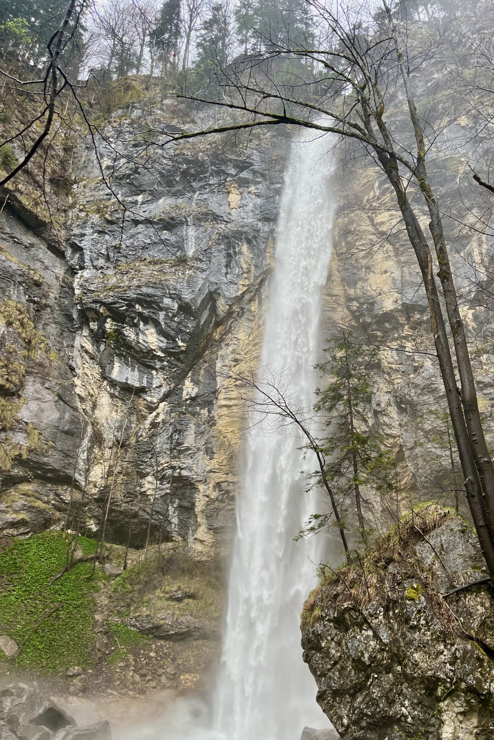 Beeindruckend ist der Blick auf den Wasserfall, vor allem, wenn nach der Schneeschmelze oder Regenfällen viel Wasser die Schossrinn nach unten fällt. Wer mag geht hinter der Sitzbank noch ein paar Meter am ungesicherten Steig weiter und kraxelt bis zum großen Becken direkt unter dem Wasserfall. Links und rechts führen auch Pfade hinter den Wasserfall. Die kleinen Wege und Felsen sind aber extrem rutschig und hier bestehen Abrutsch- und auch Steinschlaggefahr.