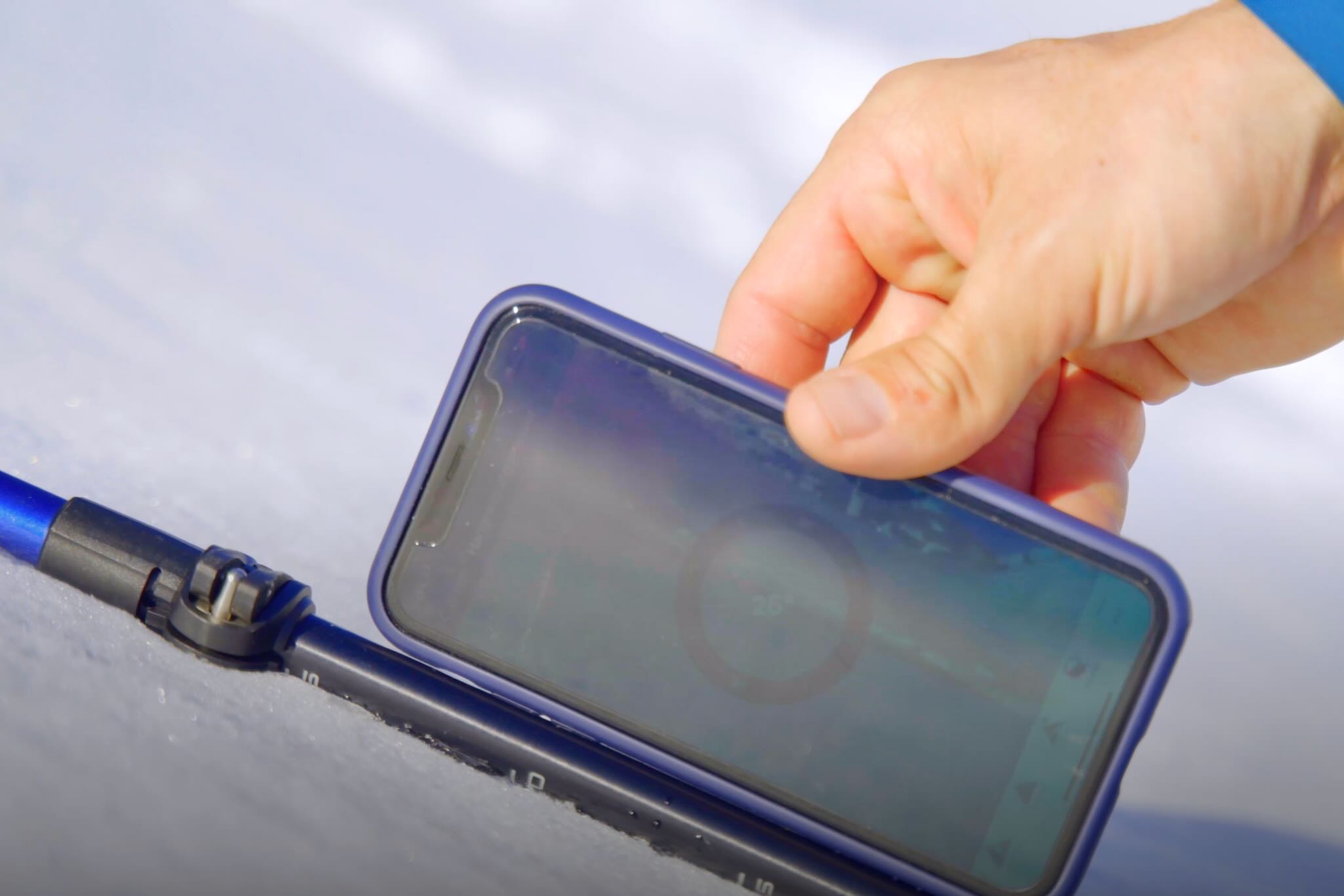 Ähnlich wie beim Hangneigungsmesser für den Skistock wird auch die Hangneigung mit dem Smartphone gemessen. Es gibt einige Apps, die teilweise bereits fester Bestandteil des Smartphone-Betriebssystems sind. Einfach die App öffnen, Smartphone auf den im Schnee parallel zum Hang platzierten Skistock legen und die Hangneigung ablesen.
