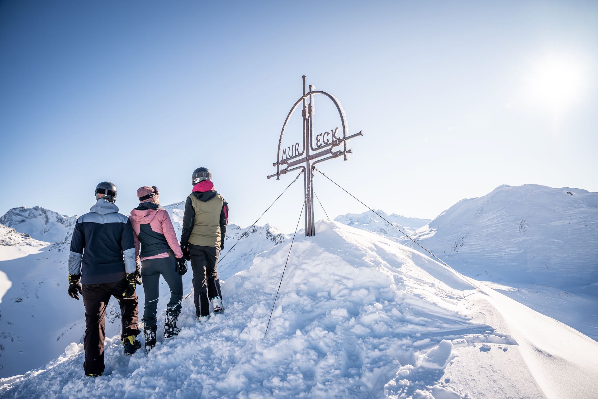 Mit dem Mureck lässt sich noch der Nebengipfel mitnehmen, was die Abfahrtsmöglichkeiten allerdings ein wenig kleiner werden lässt. Es folgt eine kurze Abfahrt in die Scharte zwischen Großem (Schöderhorn) und Kleinem Mureck. Nach einem überschaubaren Gegenanstieg ist das formschöne Gipfelkreuz auf 2.403 Meter erreicht.