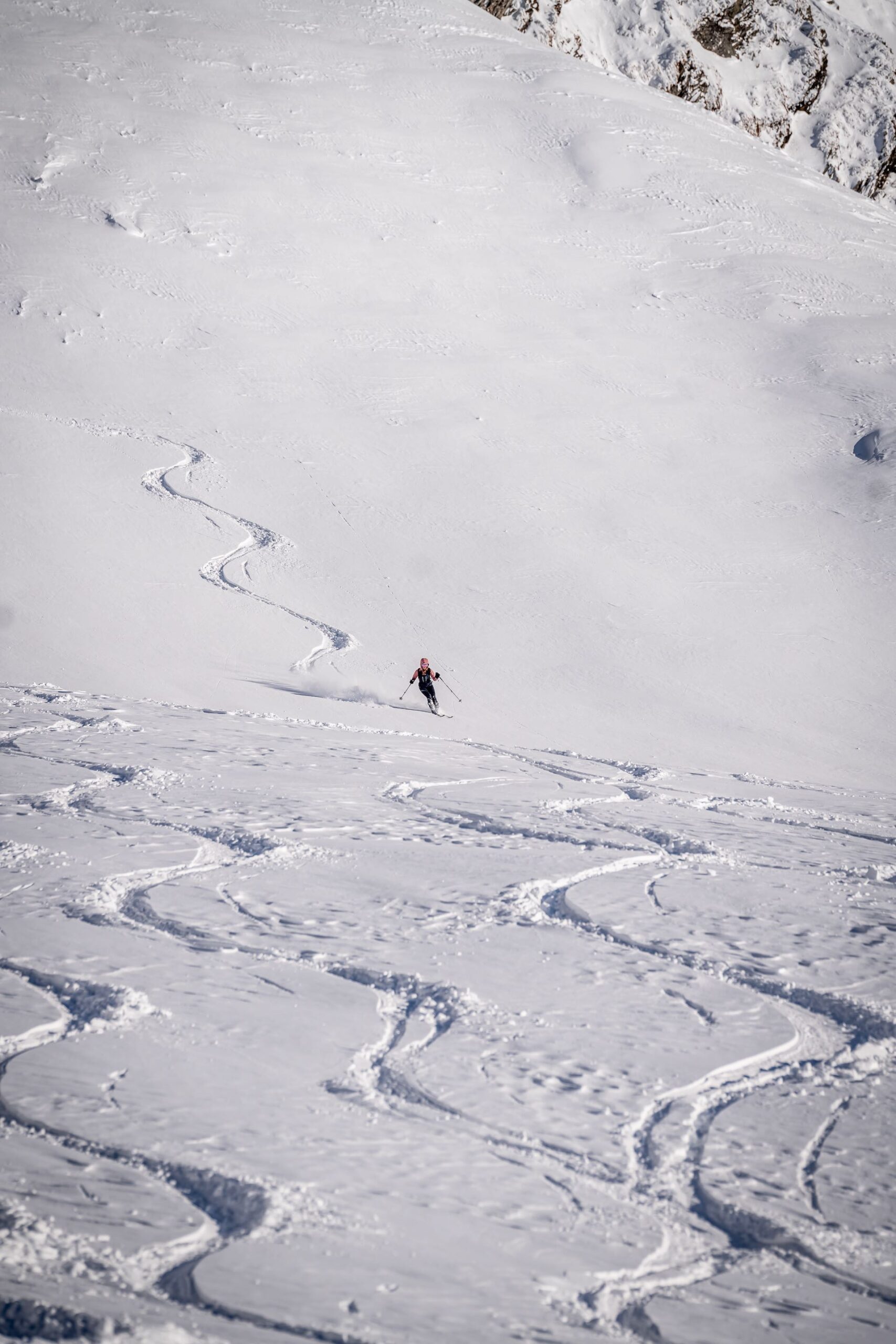 Während der Schnee bei der Abfahrt vom Mureck hinab zum Murtörl oft zu Wünschen übrig lässt (zu viel Wind), so kommt bei den folgenden 1.400-Abfahrts-Höhenmetern keiner zu kurz. Unter den steilen Felswänden der Murwand und dem Mureck im Rücken findet sich jede Menge Spielraum für weite Schwünge und auch wenn schon etliche Skitourengeher vorher unterwegs waren, so findet sich noch unverspurtes Gelände.