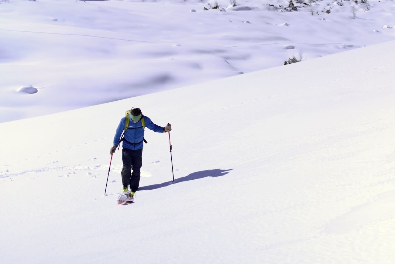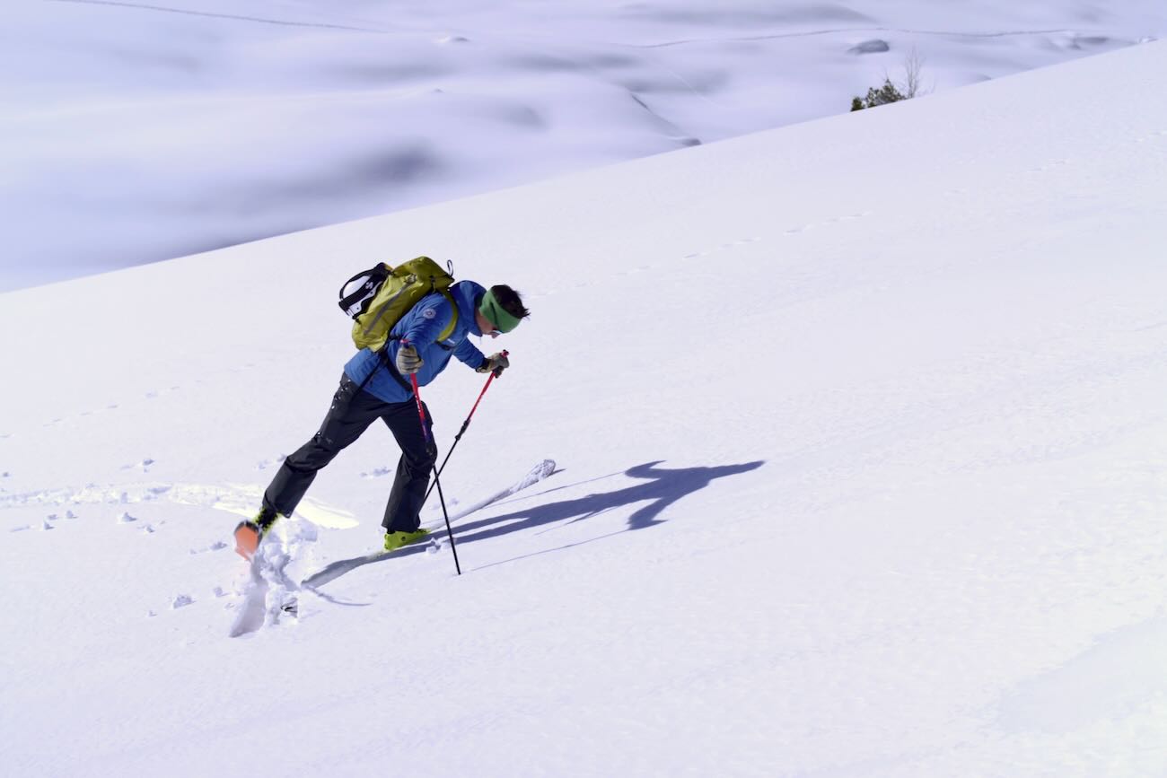 Der Aufstieg bei der Skitour hat etwas meditatives. Schritt für Schritt geht es die Hänge aufwärts. Es bleibt Zeit, den eigenen Gedanken nachzuhängen oder einfach nur die verschneite Winterwelt vor den Augen zu bewundern. Bei Anstiegen, die relativ flach verlaufen, kann für Kurven weit ausgeholt werden. Gerätst Du beim Aufstieg allerdings in steileres Gelände ist ein solch ausladender Bogen bald nicht mehr möglich.