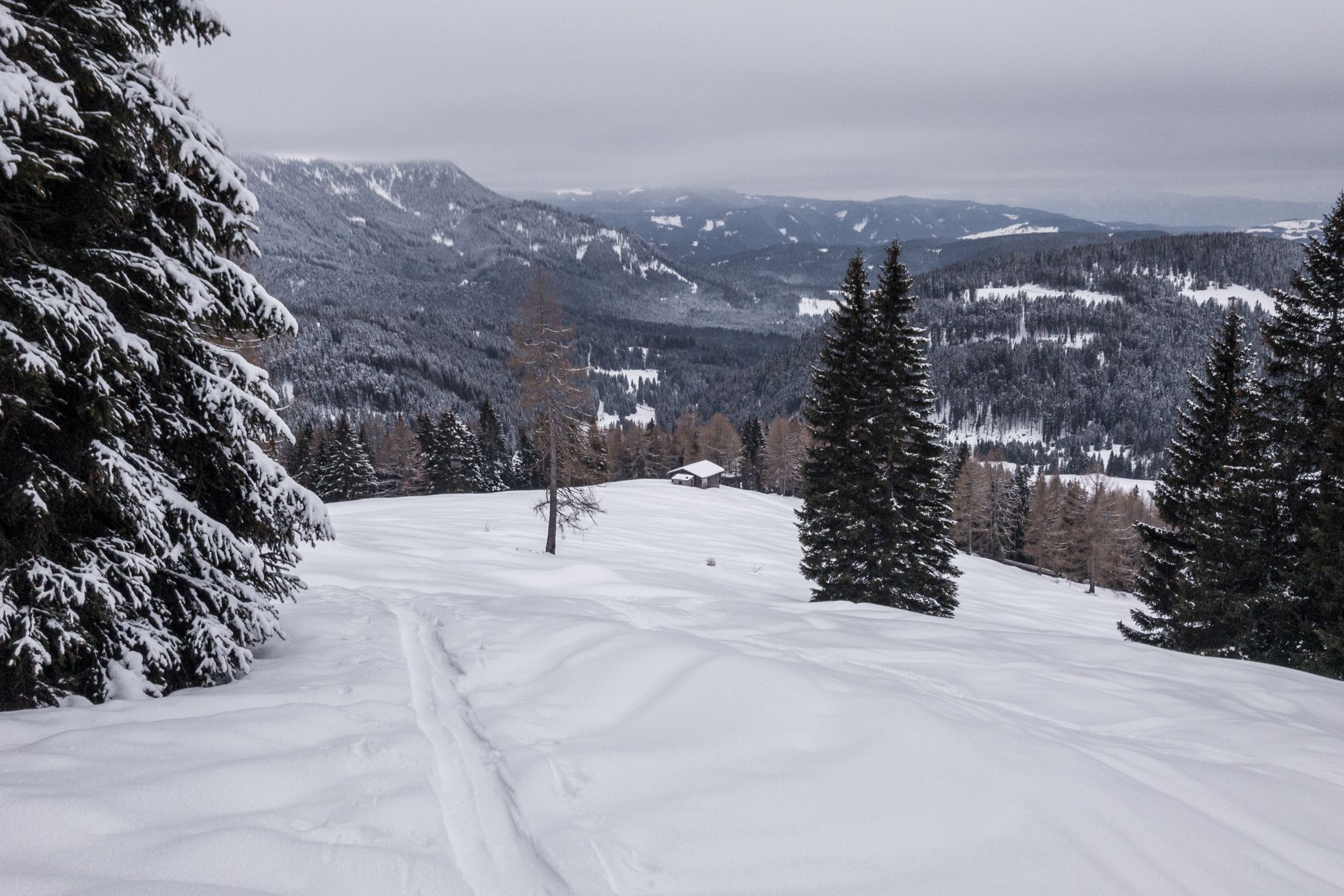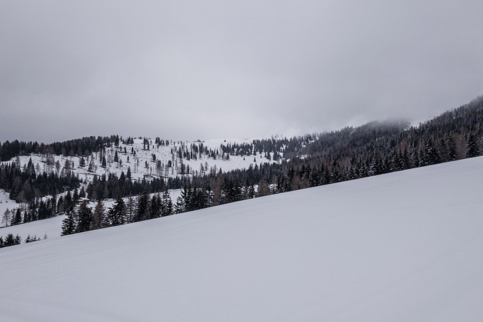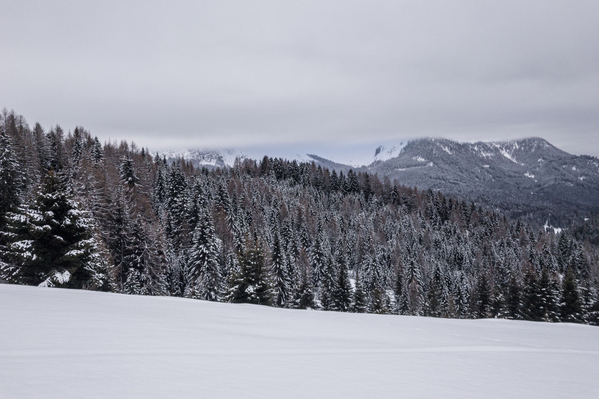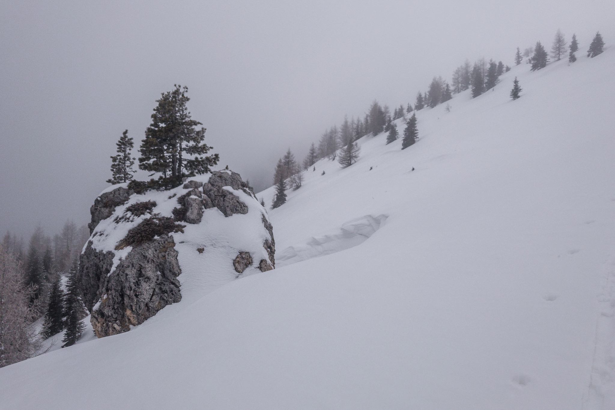Inmitten des weitläufigen Skigebiets Carezza beginnt die erste Tour direkt am Parkplatz des Berghotels Moseralm. Die ersten Meter geht es zunächst neben der Piste entlang. Am Beginn des Tschein-Liftes lassen wir den überschaubaren Trubel des Skigebiets hinter uns. Neben dem stillgelegten Schlepplift führt uns der Aufstieg nach oben. Ein kurzes Abschnallen und Überqueren der Straße folgt der weitere Anstieg über eine weite Almwiese. Die Spuren scheinen im Wald zu verschwinden, der schon kurze Zeit später zunehmend lichter wird. In breiten Kehren wird der sich immer weiter öffnende Hang erreicht, der nun bis an die Felswände der Rotwand führt.
