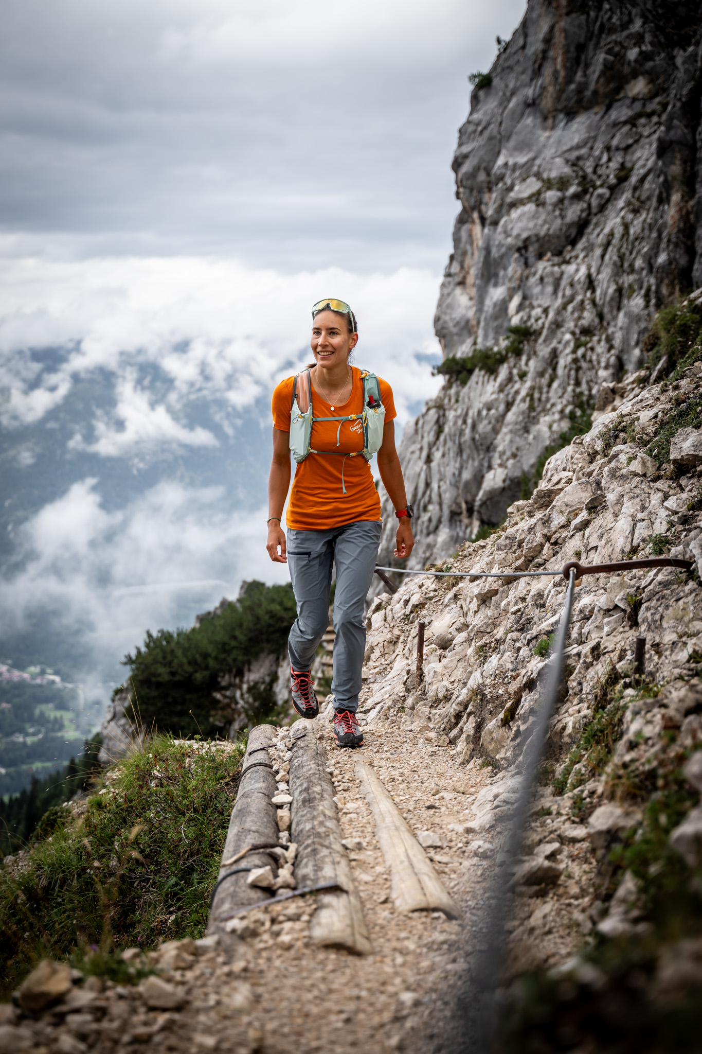 Das funktioniert in der Praxis recht gut und selbst nach längeren Aufstiegen fühlt es sich nicht nass an. Und dass obwohl das Material vergleichsweise schwer ist, so aber eben auch für Wärme sorgt. Das gute Feuchtigkeitsmanagement sorgt dann dafür, dass man am Gipfel nicht auskühlt und sich das Aufsetzen des Rucksacks nach der Pause nicht eklig anfühlt.