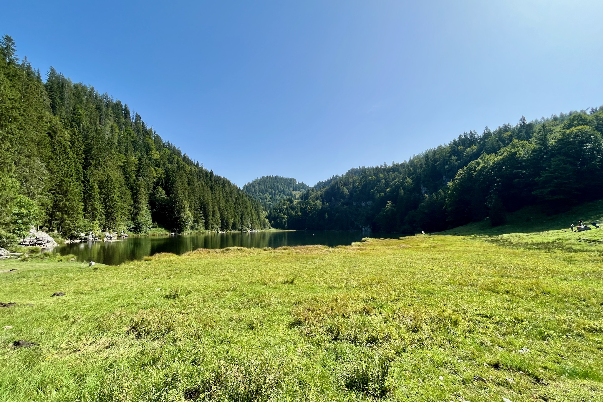 Eine knappe Viertelstunde führt der wurzelige Pfad nun weiter abwärts durch dichten Wald. Schon bald lässt sich zwischen den Bäumen schimmerndes Wasser erahnen und beinahe unmittelbar tut sich den Füßen der Taubensee auf.