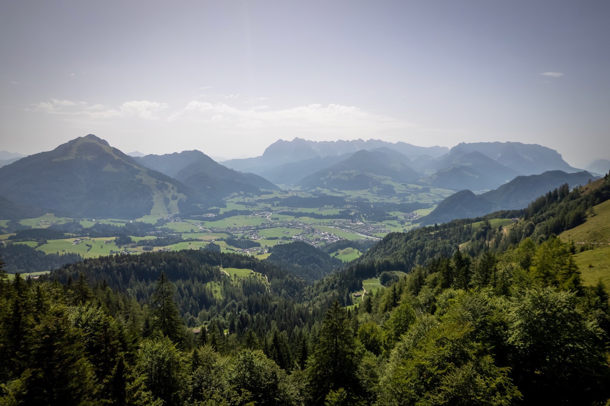 Wir wollen aber noch das Sonnwendköpfl mitnehmen, dessen Gipfel (1.278 m) wir schon kurz darauf erreichen und von dem sich ein gigantischer Blick über Kössen bis hinüber zum Kaisergebirge mit Wildem und Zahmem Kaiser auftut.