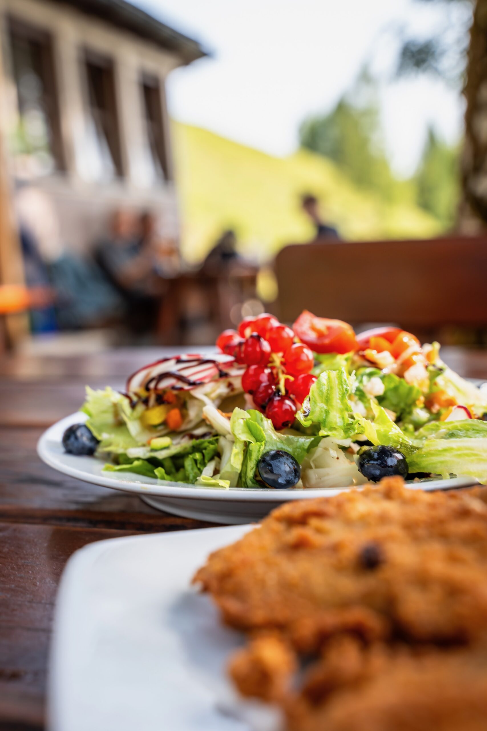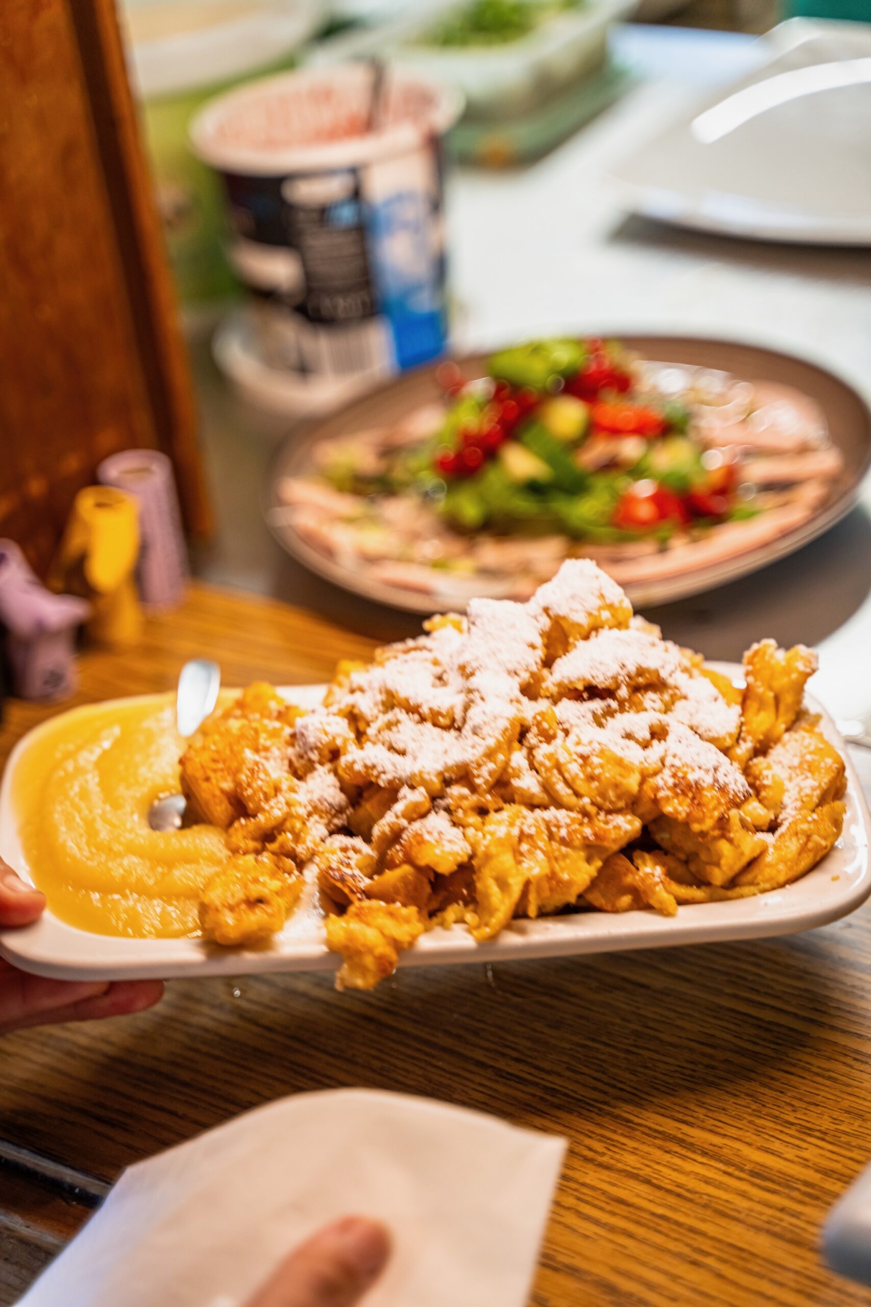 In der Küche sorgt Wirtin Annemarie dafür, dass hier alles frisch zubereitet wird. Vom Schnitzel über den Kaiserschmarrn bis hin zu hausgemachten Kuchen. Die schmecken auf der Terrasse mit einem ähnlichen Ausblick wie vom Sonnwendköpfl ganz hervorragend.
