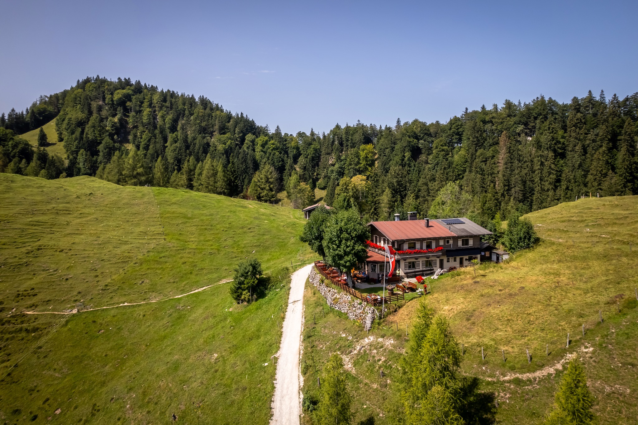 Unser Abstieg beginnt direkt unterhalb der Taubenseehütte und führt uns auf dem Fahrweg sehr sehr steil hinab. Wir folgen den Wegweisern zur Frankenalm und schließlich auf dem vom Aufstieg bereits bekannten Weg zurück zum Parkplatz am Mühlberg in Kössen.