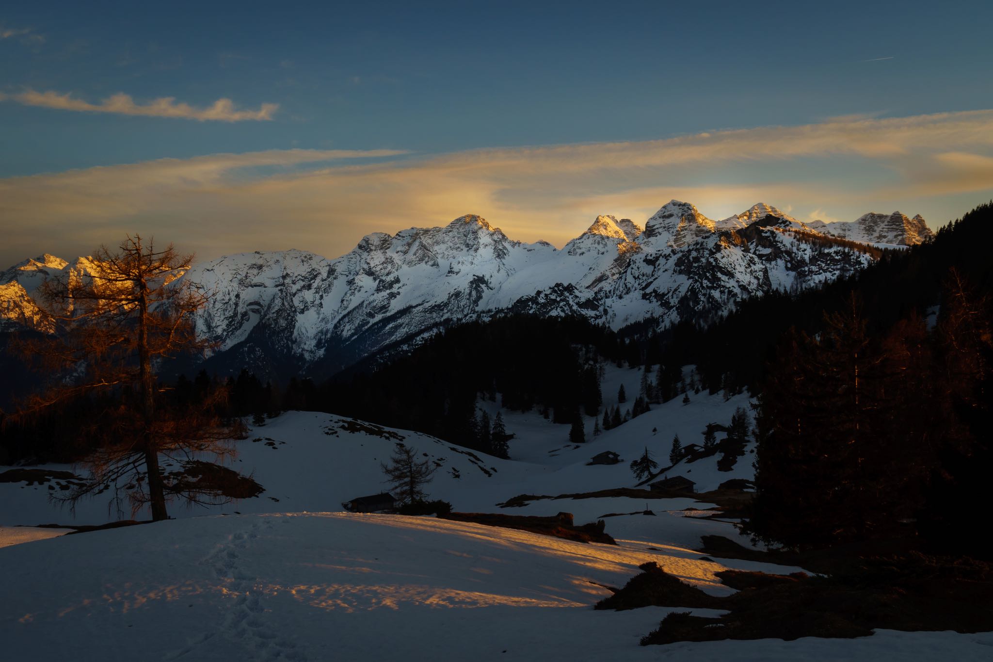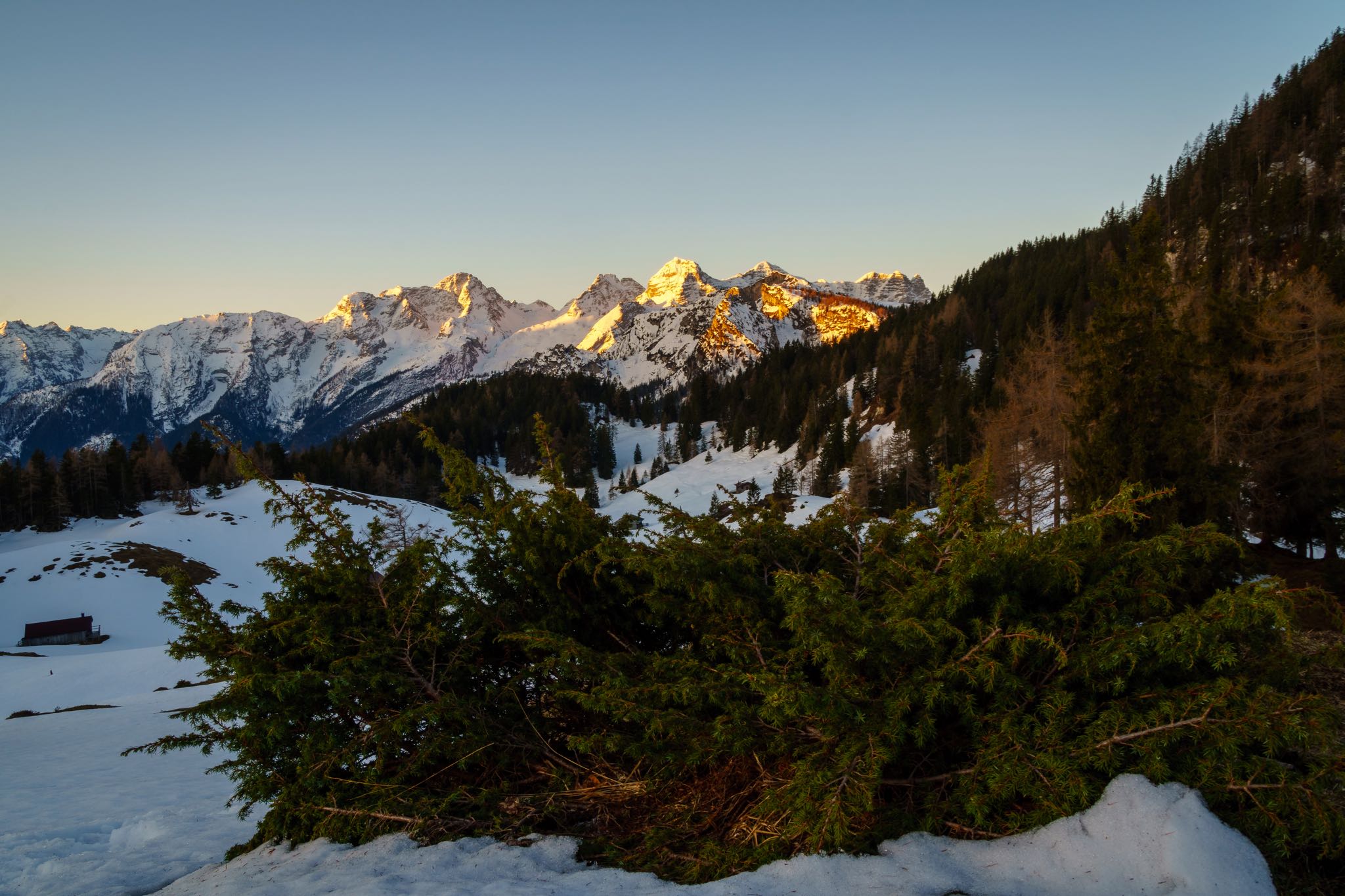 Der Aha-Effekt dieser Wanderung setzt pünktlich beim Erreichen der Scharte und des Gipfelplateaus, an deren Fuß sich ein paar Hütten auf der Thällernalm schmiegen, ein. Die Sonne schaut kurz vor ihrem Untergehen im Rücken nochmal vorbei. Vor uns leuchten die schneebedeckten Felsmassive vom Hochkalter, dem Hochkranz bis zu den Loferer Steinbergen im glühenden Abendlicht.