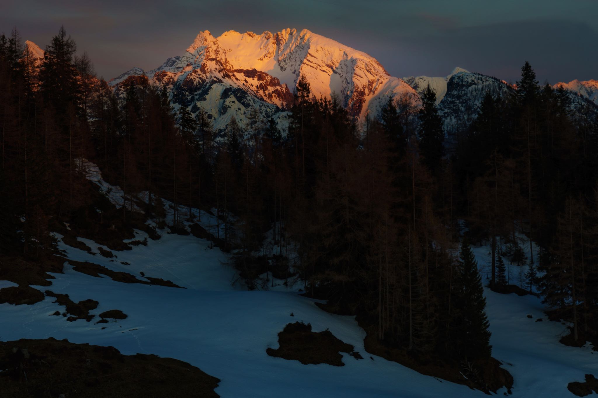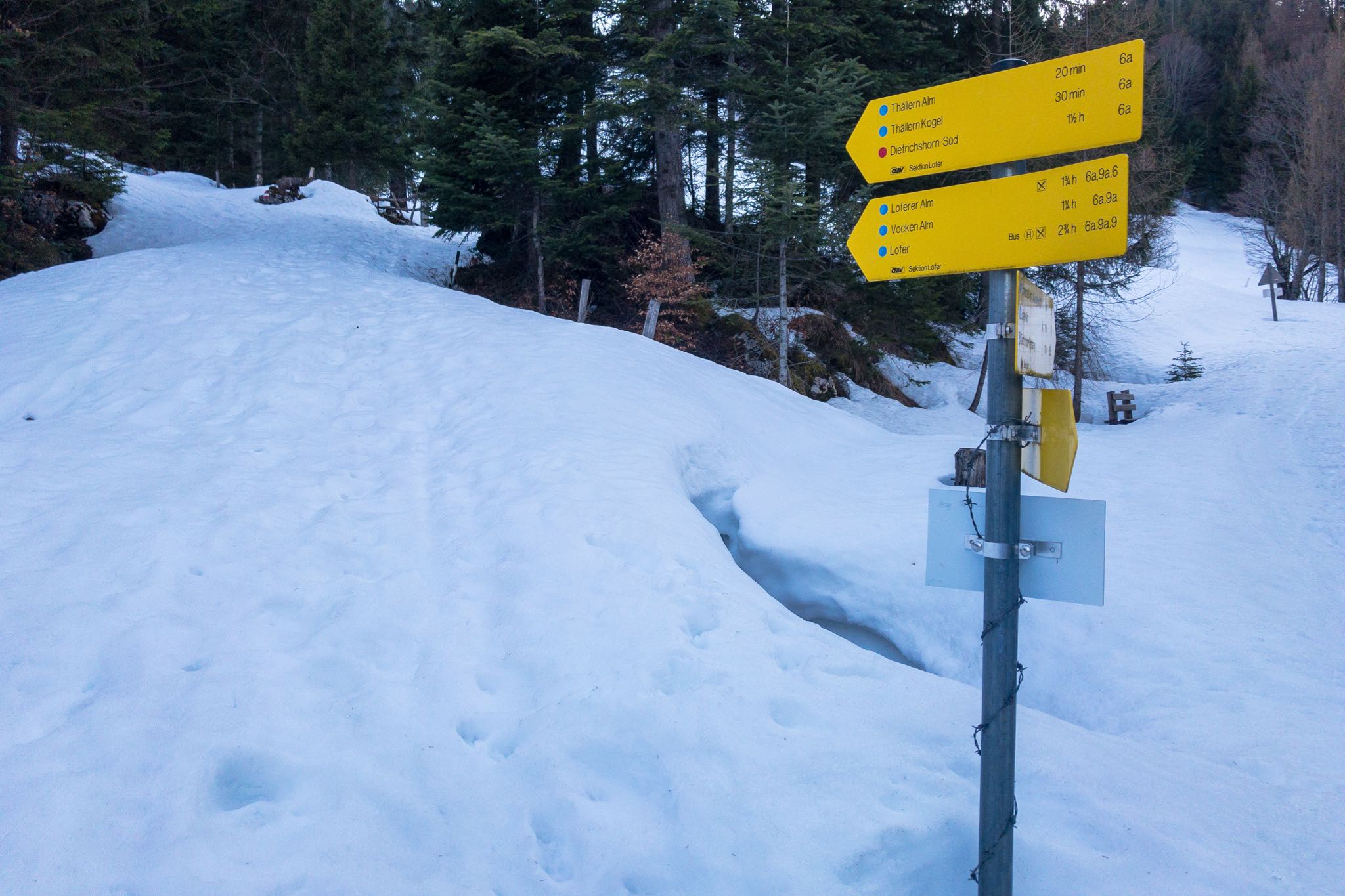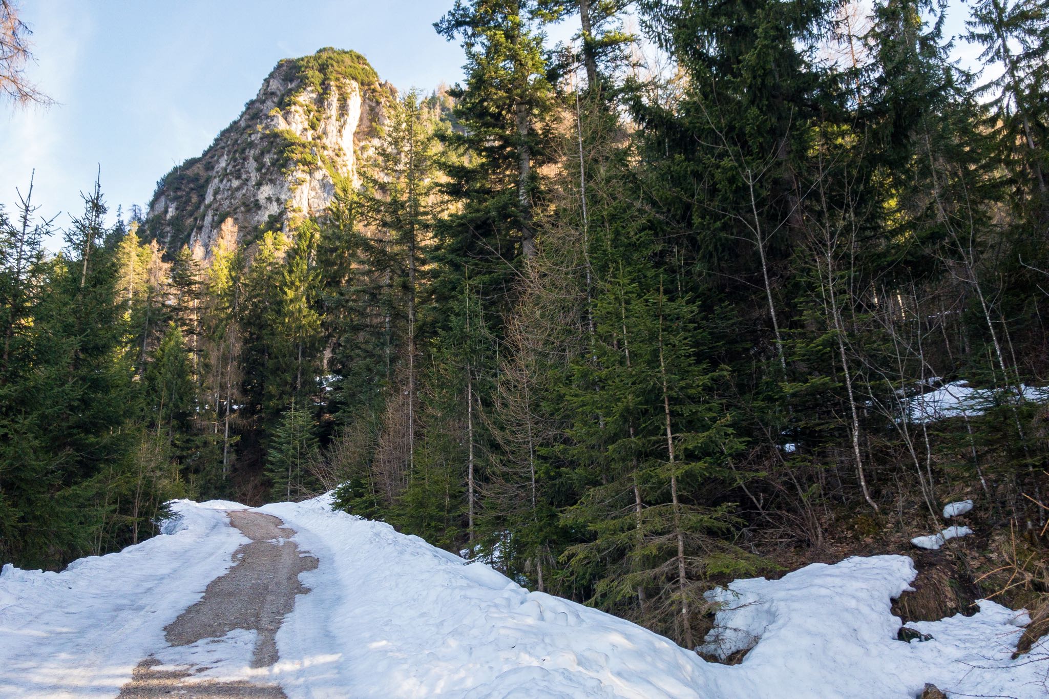 Der Schnee hält sich auch hier noch wacker, stellt trotz frühlingshaften Bedingungen aber keine Gefahr in Form von Gleitschneelawinen dar. Der Aufstieg über die Forststraße wird von kurzen Abstechern durch den Wald unterbrochen. Immer wieder werden plätschernde Rinnsale und Bäche überquert, die vom Dahinschmelzen des Winters zeugen.