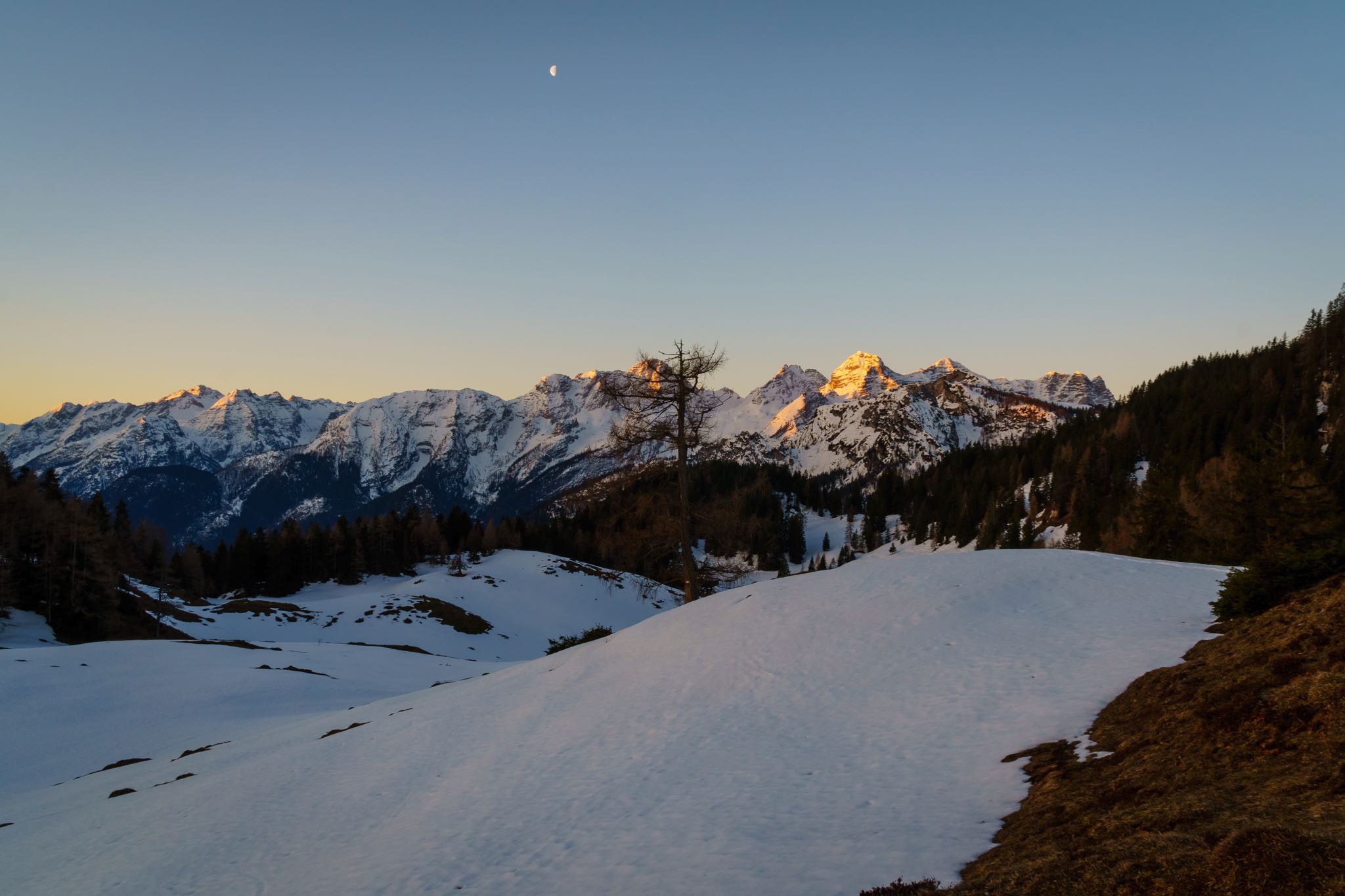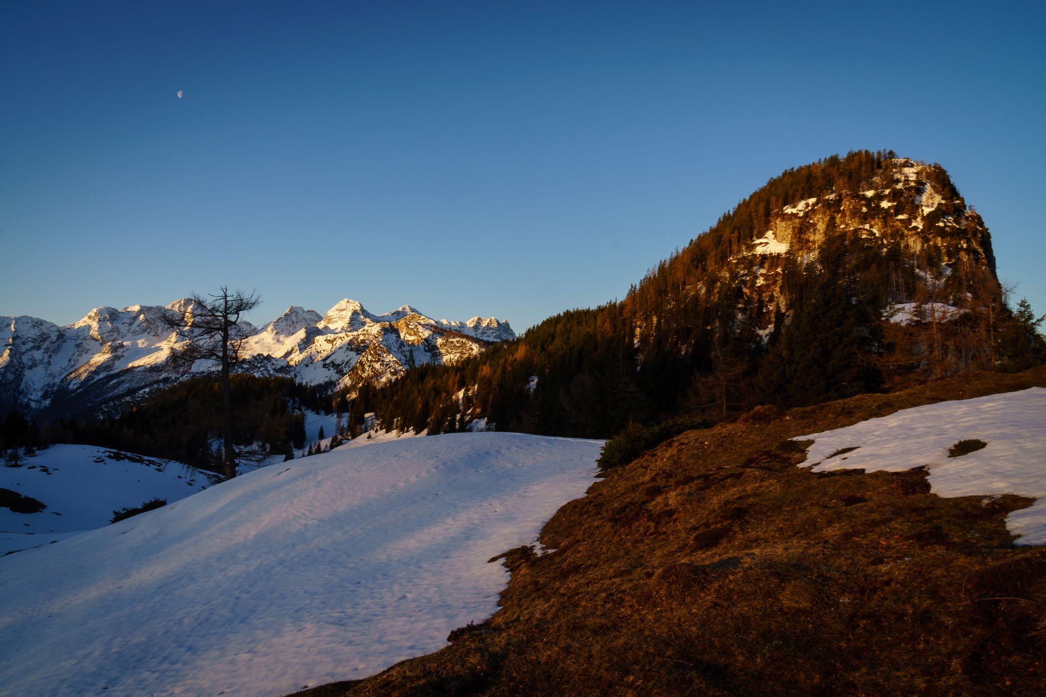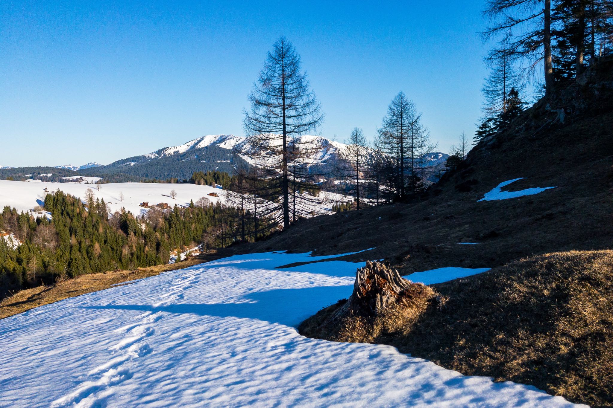 Der Schnee hält sich auch hier noch wacker, stellt trotz frühlingshaften Bedingungen aber keine Gefahr in Form von Gleitschneelawinen dar. Der Aufstieg über die Forststraße wird von kurzen Abstechern durch den Wald unterbrochen. Immer wieder werden plätschernde Rinnsale und Bäche überquert, die vom Dahinschmelzen des Winters zeugen.