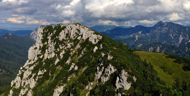 Kurz darauf treffen wir auf den Steig, der von der Röthelmoosalm heraufkommt. Hier geht es nach rechts und anschließend gleich wieder nach links. Die Hörndlwand ist bereits ausgeschildert. Es geht leicht, aber stetig bergan. An einem auffälligen Steinmandl halten wir uns links und folgen dem Pfad auf den Gurnwandkopf, wo im oberen Bereich ein kleines bisschen gekraxelt werden muss.