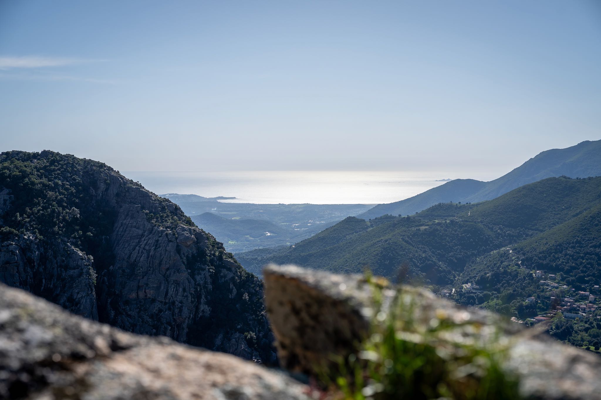An durchlöcherten Felsen geht es vorbei (und hindurch) bis zum Ausstieg des Via Ferrata de Tolla Klettersteigs, nur wenige Meter vom Gipfel des Monte Latu (742 m) entfernt. Von hier blicken wir nicht nur zurück zum Stausee und hinab in den Klettersteig, sondern auch durch das lange Tal bis zur Küste, wo das Meer einladend glitzert.
