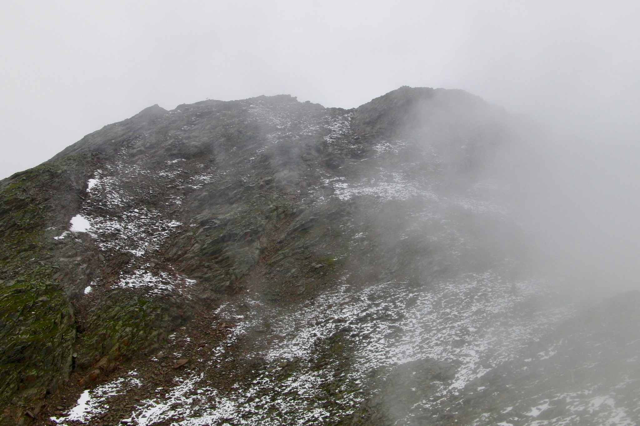 Das Glück ist uns auf unserer Mehrtagestour nicht hold und beschert uns keinen weiteren Sahne-Tag. Um dem Hüttenkoller im Sellrain vorzubeugen, wagen wir uns an die Besteigung der Haidenspitze. Das schrofige Gelände ist im steten Regen kein großes Problem, bietet aber trotzdem die Möglichkeit für Fehltritte und ist nicht zu unterschätzen. Je näher wir dem Gipfel auf 2.975 m gelangen, desto felsiger und seifiger wird der Untergrund, denn der Himmel überschüttet uns mit glitschigem Schneeregen. Aufgeben ist keine Option und nie wird es bedenklich oder riskant, aber Gipfelfreude sieht trotzdem anders aus. So schnell wie es geht, eilen wir wieder hinab in die Neue Pforzheimer Hütte, schälen uns aus den klitschnassen Klamotten und wärmen uns am Kachelofen. (gesamt ca. 665 hm Aufstieg, Gehzeit: 3 h)