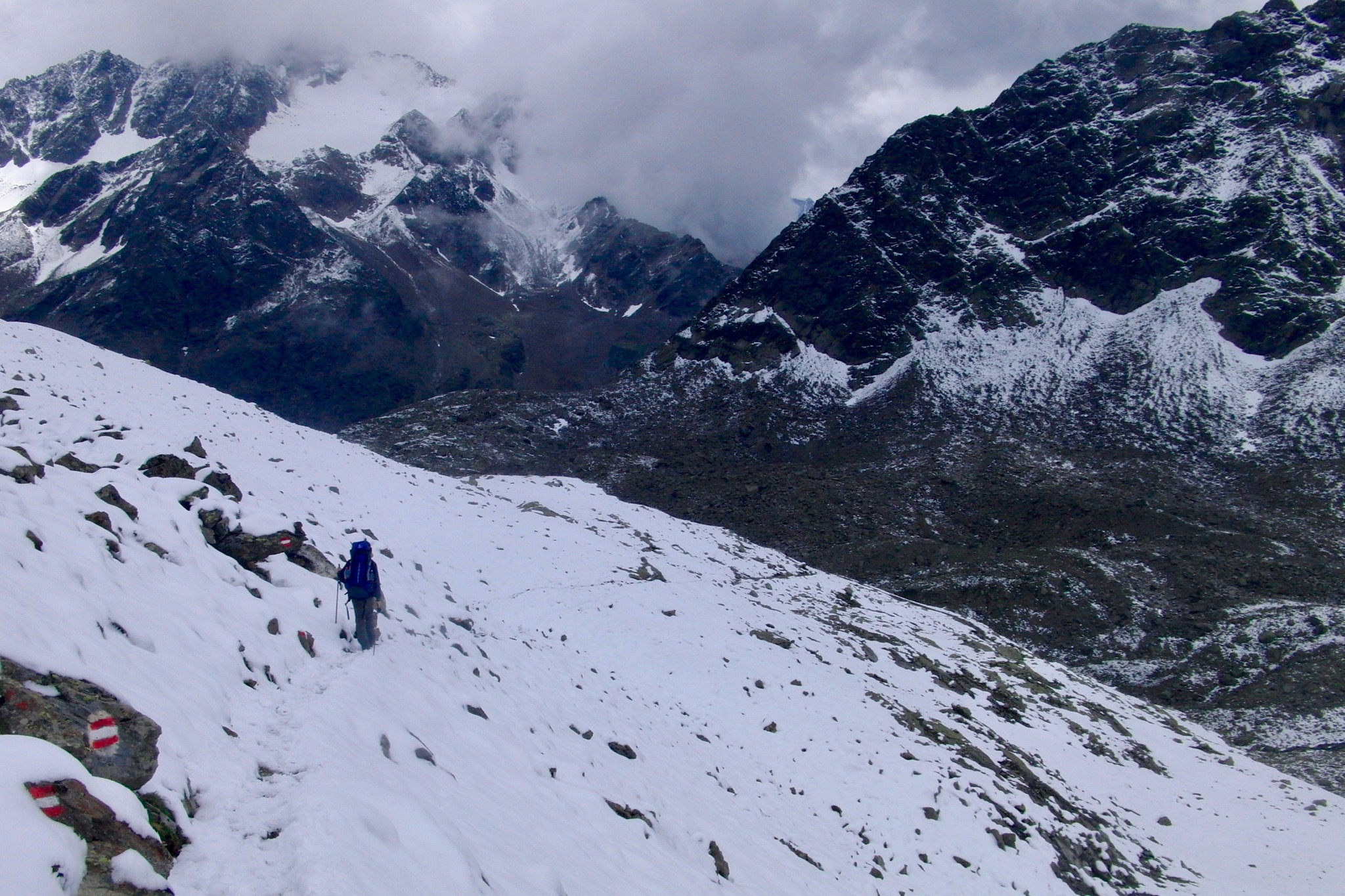 Nachdem wir den See an seiner Ostseite passieren, tauchen wir an seinem Südende tief hinein in die Stubaier Alpen und das Sellrain. Während der Steig nach rechts auf den 3.016 m hohen Sulzkogel weiterführt, halten wir uns links gen Finstertaler Scharte, stoßen bald auf ein paar der Sonne trotzende Schneereste und beobachten eine Lawine, die zwischen Schöllerkogel und Kraspesspitze hinab donnert. Unschwierig erreichen wir die Scharte auf 2.777 m, während ein erster leichter Schneefall einsetzt, der uns die Laune aber nicht verderben soll.