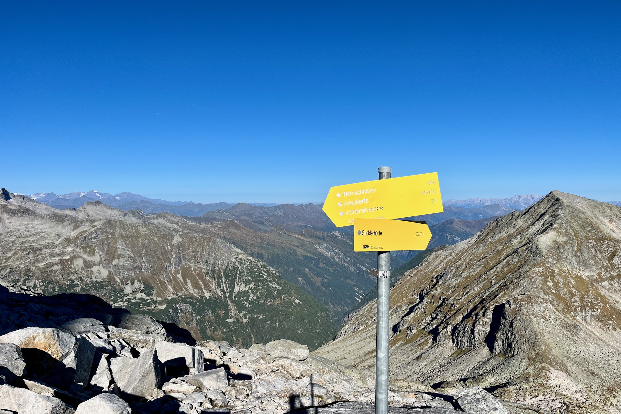 Der türkise farbene Kölnbreinspeicher liegt zu Füßen und der Blick vom Gipfel erstreckt sich weit hinein ins Maltatal. Auf der anderen Seite des Stausees thront die Hochalmspitze und dieser Blick ist für den kommenden Abstieg zur Marchkarscharte und bis fast zur Kölnbreinsperre der ständige Begleiter. Die Spuren des Gletschers, den es hier auf der Südseite einst gab, sind noch deutlich erkennbar.
