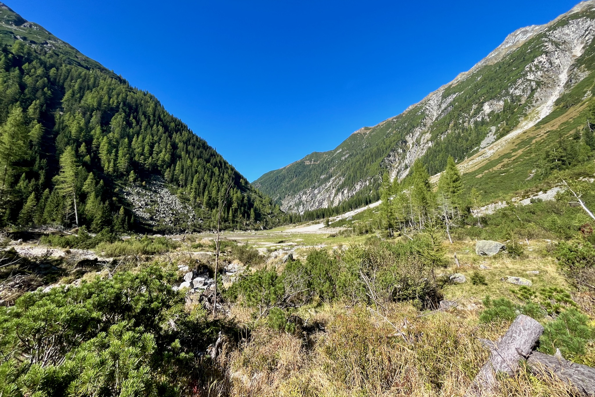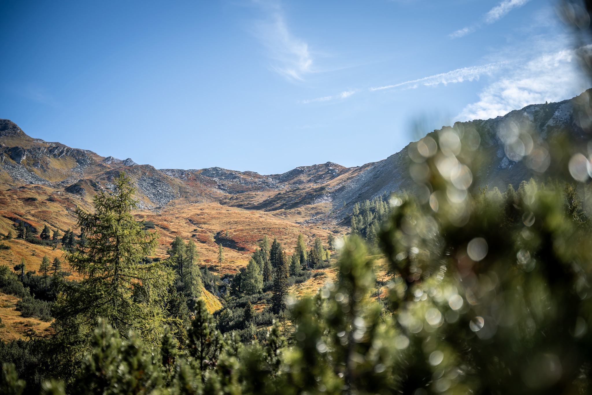 Hinter der Kreealm führt der weitere Aufstieg in weitläufige Lärchenwälder, die nach dem ersten Frost im Herbst in wunderschönen Orangetönen leuchten. Fast so wie der Himmel über dem Großarltal nach einem spektakulären Sonnenuntergang. Wenn sich die Bäume lichten, öffnet sich der ganze Kessel, der vom Mureck und Schöderhorn umrahmt wird. Im Winter übrigens ein sensationelles Skitourenrevier.