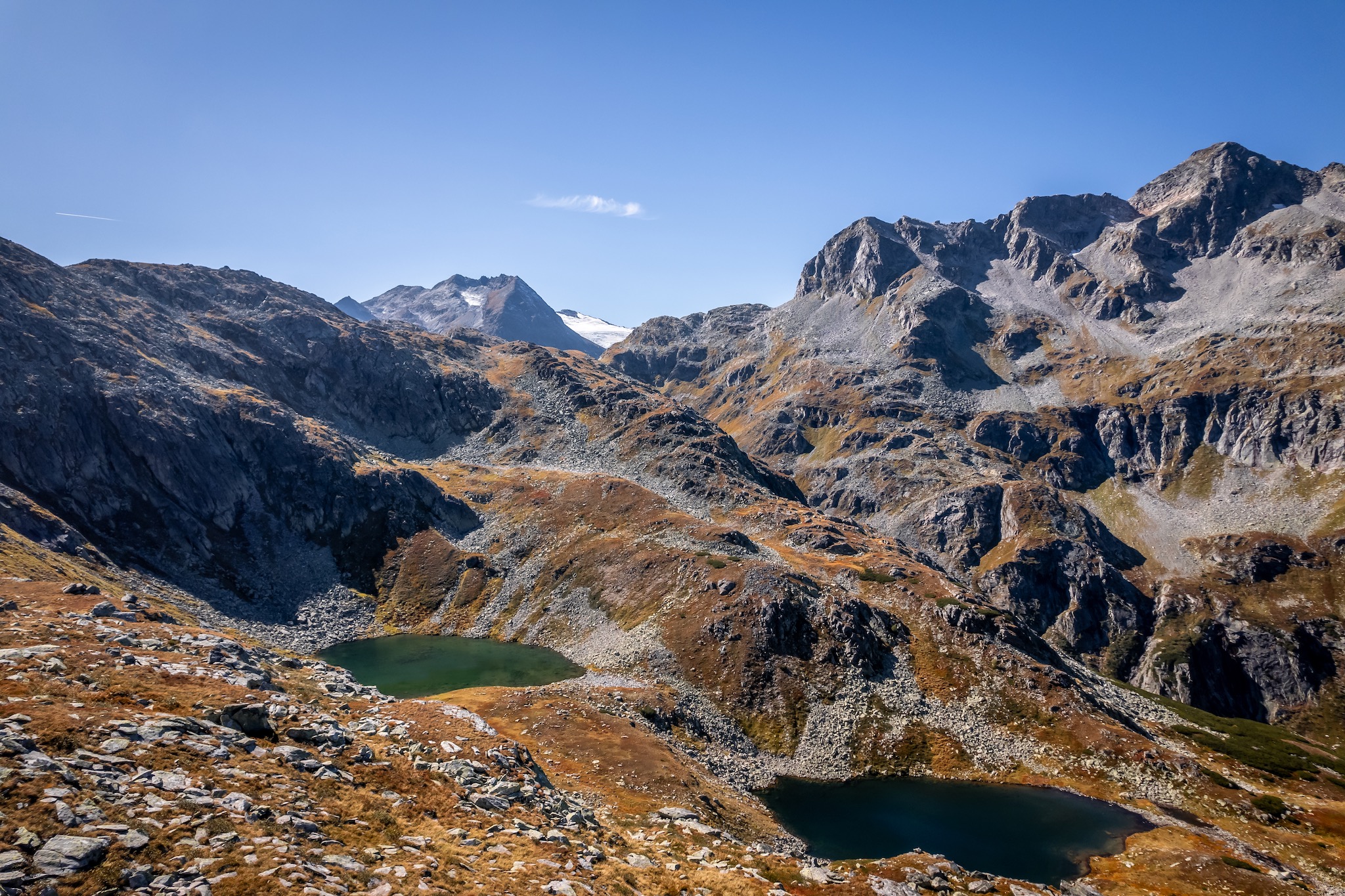 Der folgende Abstieg ist zumindest im ersten Teil ein wahrer Genuss. Majestätisch reihen sich die Berge der Hohen Tauern auf, es warten grandiose Tiefblicke zu den beiden Kolmseen, deren Wasseroberfläche in der Sonne glitzert.