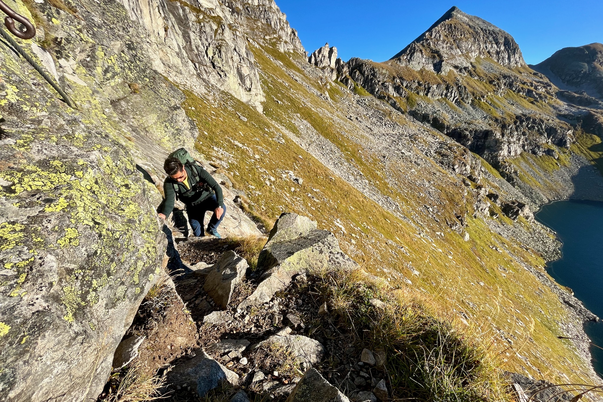 Nach einer durchwachsenen, aber ruhigen Nacht heißt es früh aufstehen, um die Sonne hinter dem Unteren Schwarzsee aufgehen zu sehen. Der kurze Anstieg zur Schmalzscharte vertreibt die letzte Müdigkeit, erst recht der anschließende steile Abstieg. Stahlseile geben an den ausgesetztesten Passagen Halt.