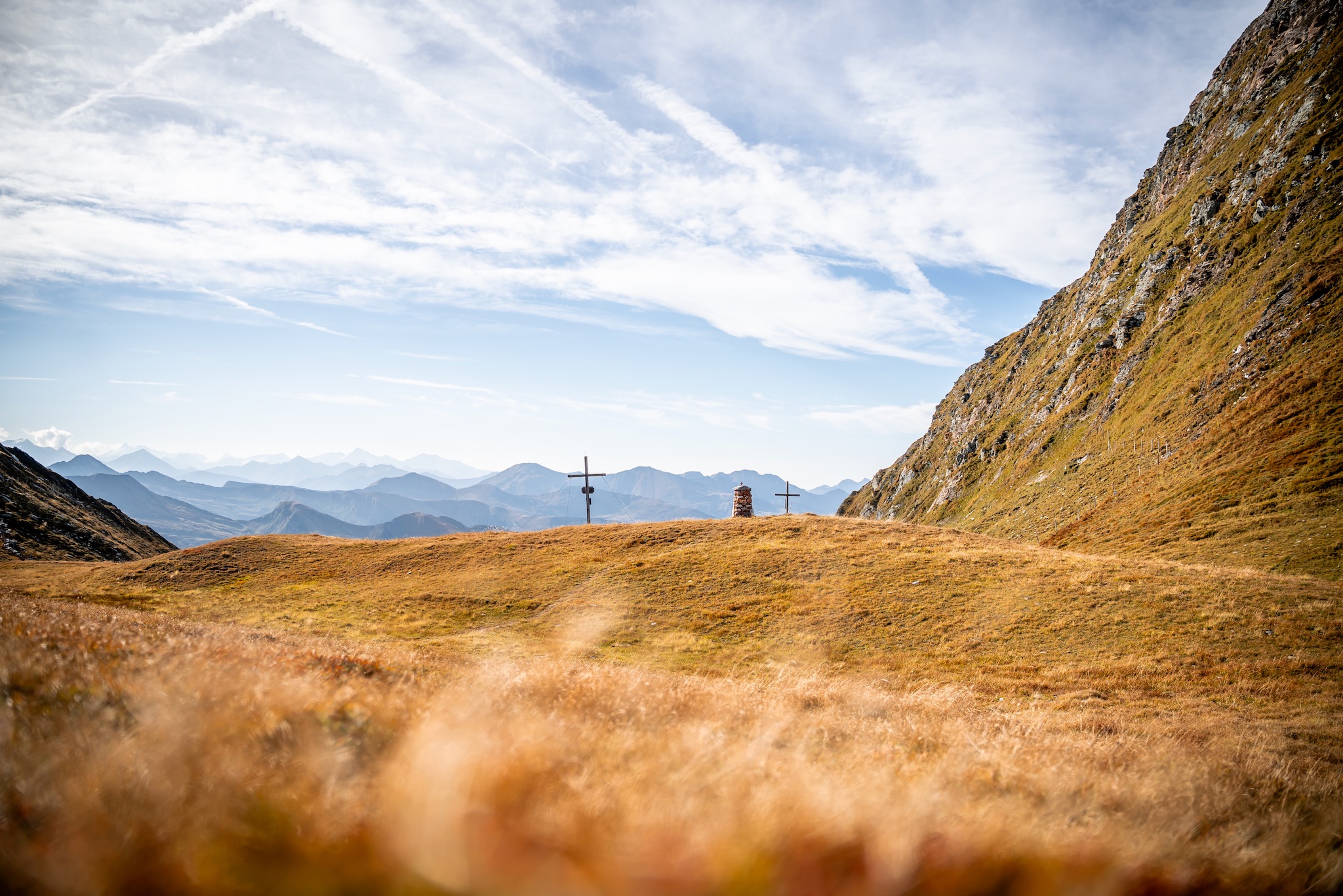 Nur knapp 140 Höhenmeter trennen das Murtörl vom Mureck. Der Gipfel ist dann auch schon nach wenigen Minuten unschwierig erreicht. Vom 2.402 Meter hohen Gipfel mit dem wohl schönsten Gipfelkreuz des Großarltals tut sich ein atemberaubendes Panorama auf. Hinab in den Kessel, der von der Kreealm herauf zieht. Und vor allem hinüber, tief hinein in den Nationalpark Hohe Tauern mitsamt der Tauernkönigin, wie die Hochalmspitze auch genannt wird.