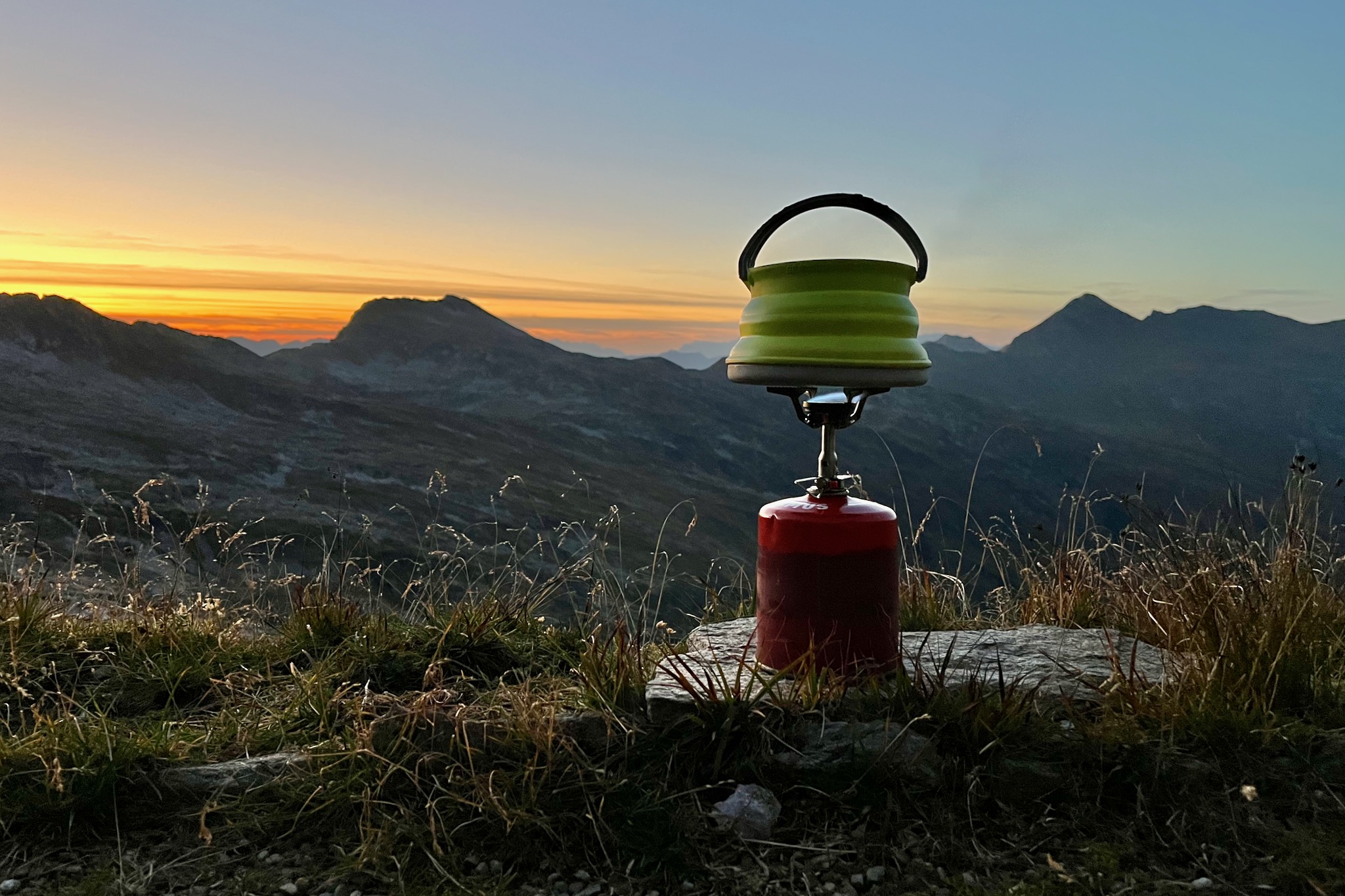 Langsam senkt sich die Sonne dem Horizont entgegen und schließlich verschwindet sie hinter dem Mureck. Kurz darauf leuchtet der Himmel in allen Orangetönen, die die Farbpalette zu bieten hat. Vor mir auf dem Gaskocher zündeln die kleinen Flammen um den Boden des Topfes, in dem eine Brühe vor sich hin köchelt. Und es ist still. Nur ab und zu verirrt sich ein letztes Zwitschern in die Stille der aufkommenden Nacht.