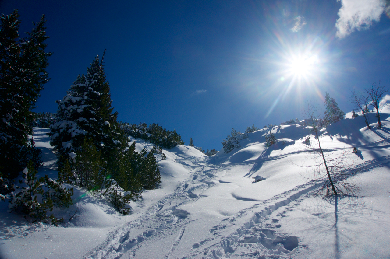 Fluffiger Pulverschnee, Sonne satt. So malt man sich die perfekte Skitour in seinen kühnsten Träumen aus. Am Zäunlkopf im Karwendel ist sie wahr geworden.